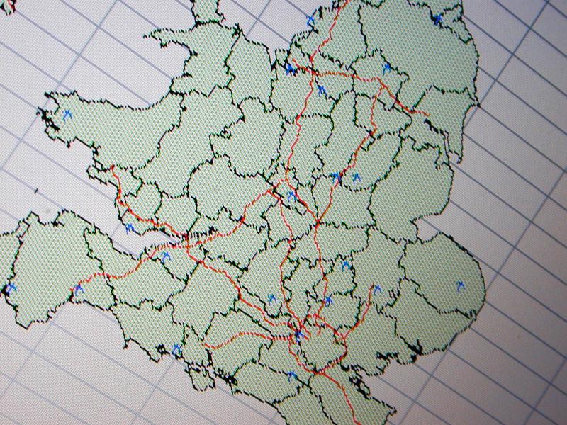 Image Description: Close up of green map with black borders and red lines indicating roads on a block background