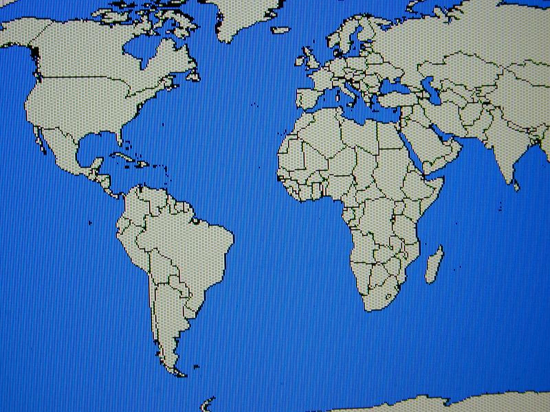 Image Description: Blue seas and gray shaded countries on digital political map with the Americas, Africa and Europe and Western Asia