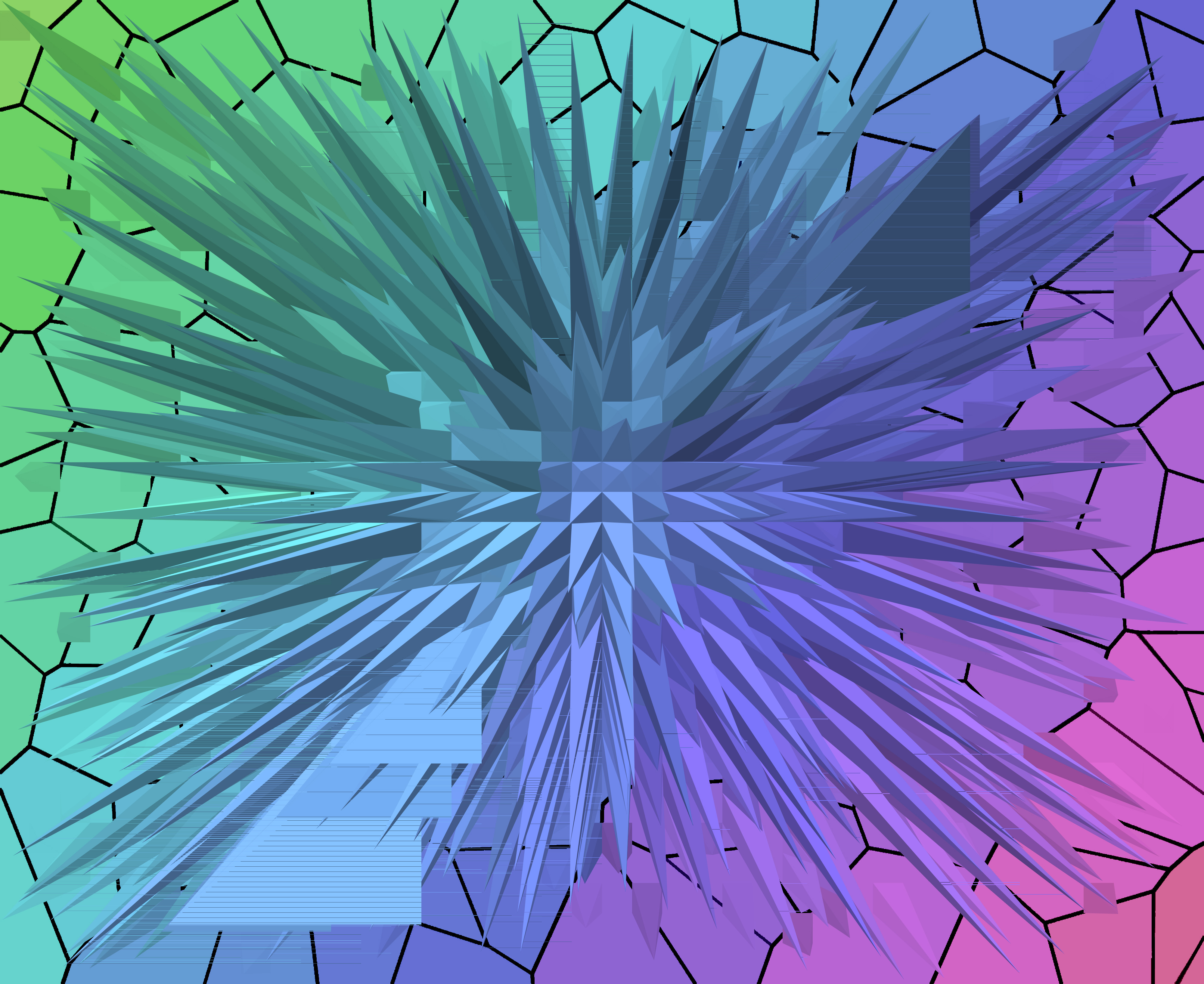 Image Description: Explosion of Spikes on Polygon Shaped Background with Gradient Colors in Green, Blue and Purple - Dynamic Abstract Background