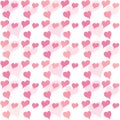Image Description: Romantic border of colored hearts in white pink and red arranged in rows on a textured wooden background with copy space