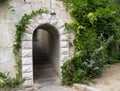 Image Description: Pass under the arch through an old thick stone wall with green foliage