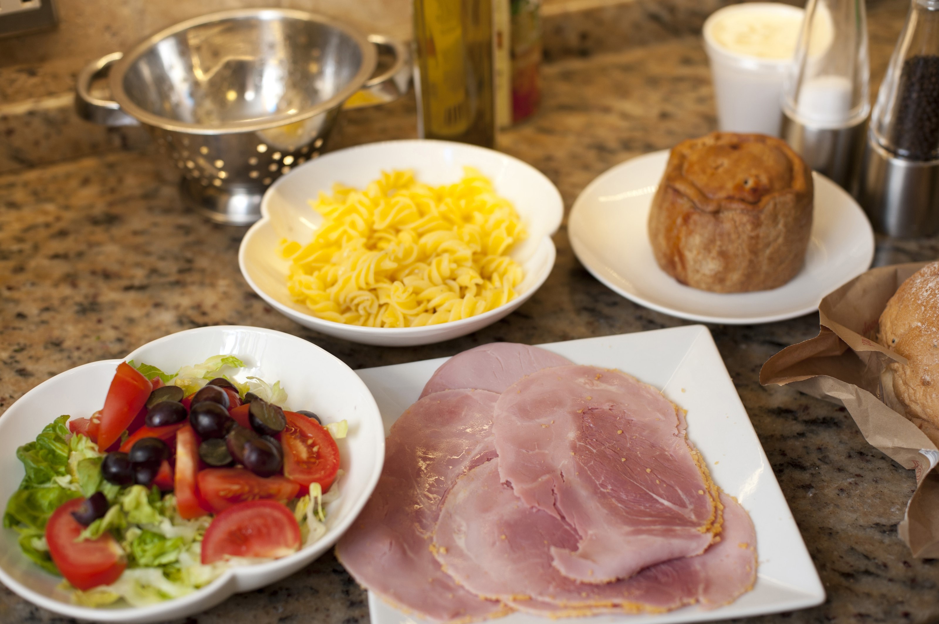 Image Description: Cold buffet lunch laid out on a rustic table with pasta, sliced cured ham, cold pork pie and a mixed salad with olives