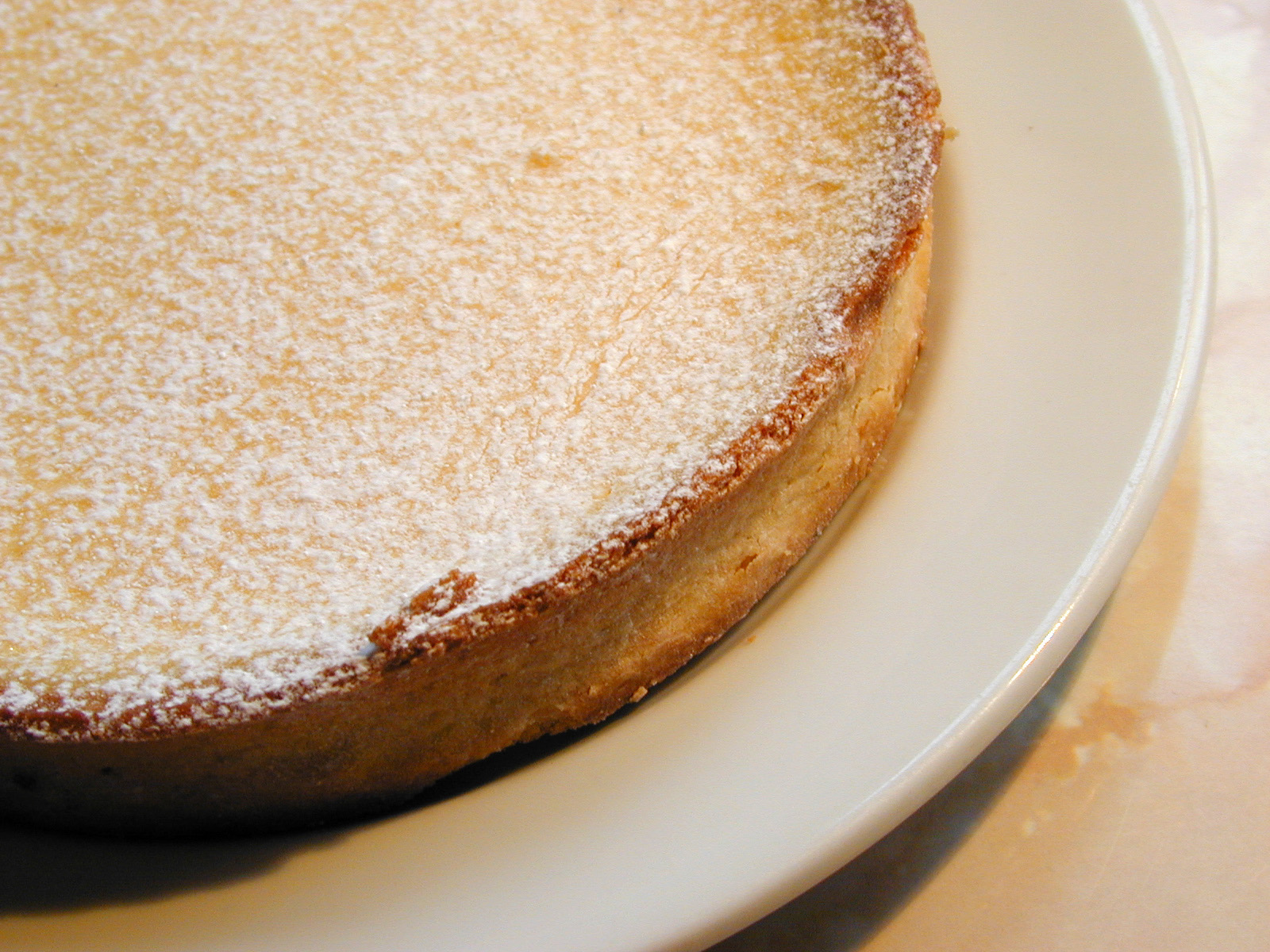 Image Description: Freshly baked golden crispy pastry pie crust sprinkled with icing sugar served on a plate in a close up culinary or baking background