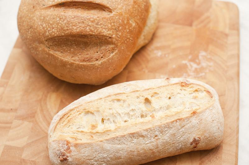 Image Description: Two fresh crusty loaves of bread on a wooden bread board ready for breakfast, making a snack or as an accompaniment to dinner