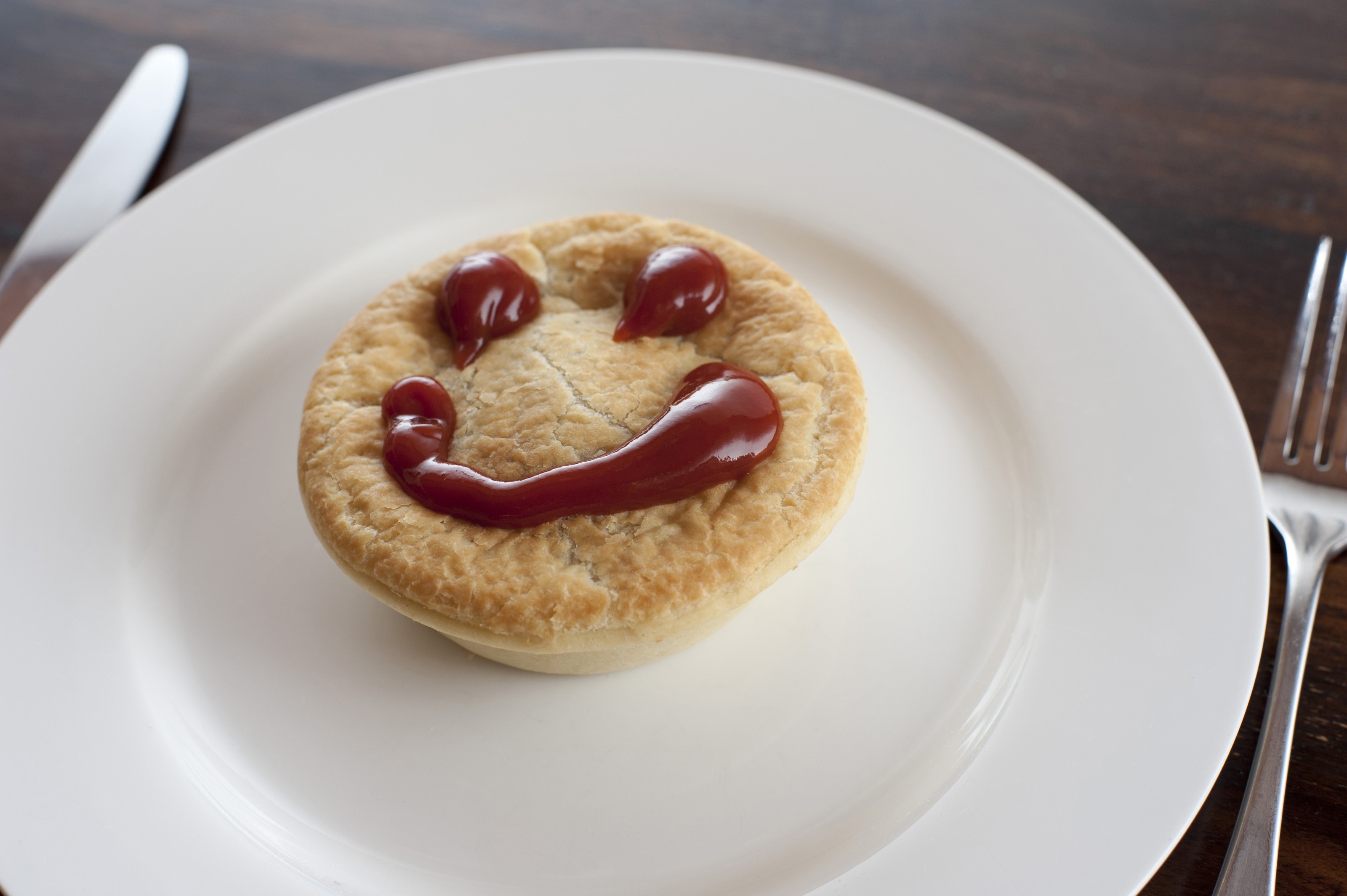 Image Description: Meat pie with a happy face made of tasty sauce on top of the pastry crust served on a plain white plate