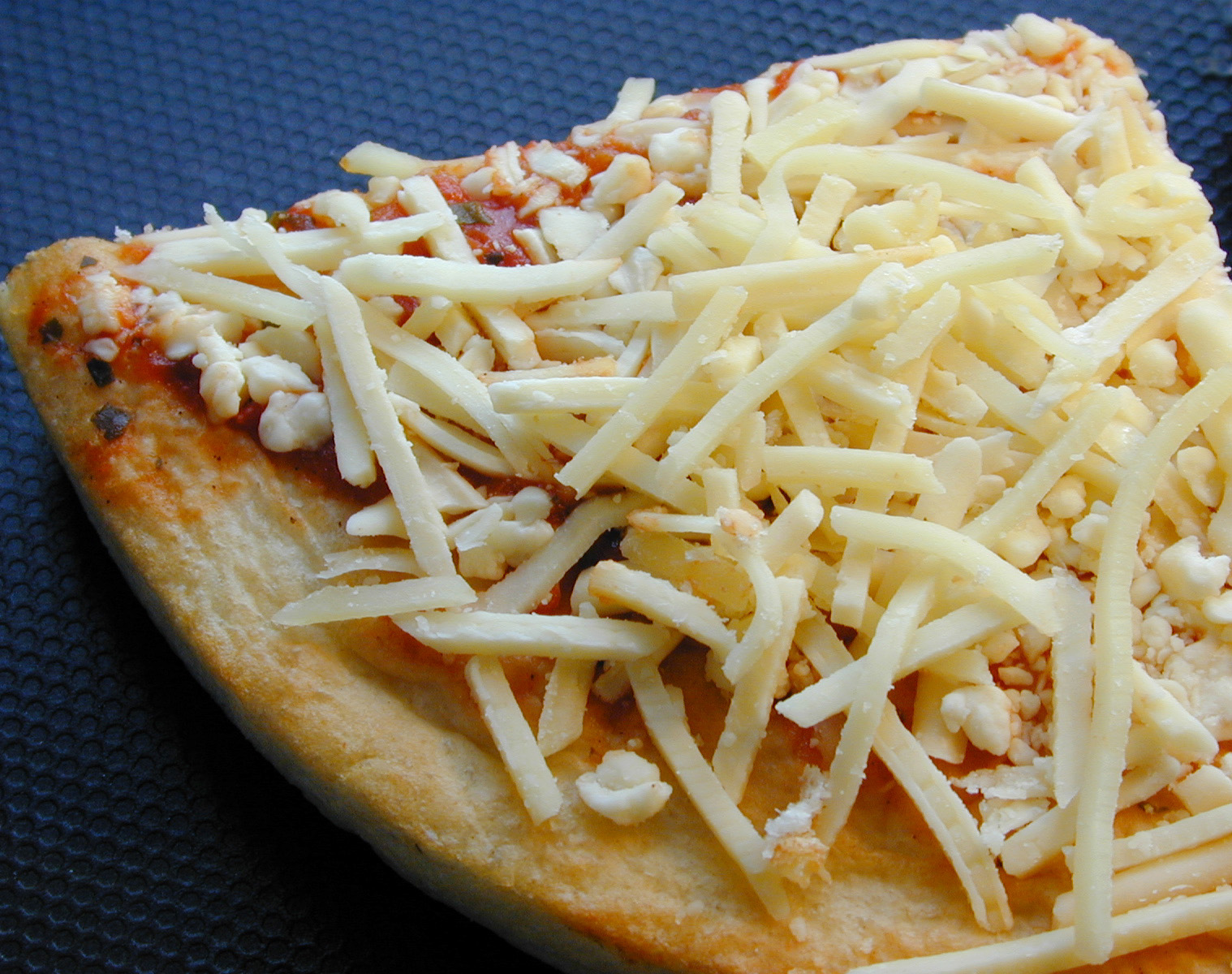 Image Description: Slice of uncooked Italian pizza with a pastry base topped with tomato paste and grated cheese
