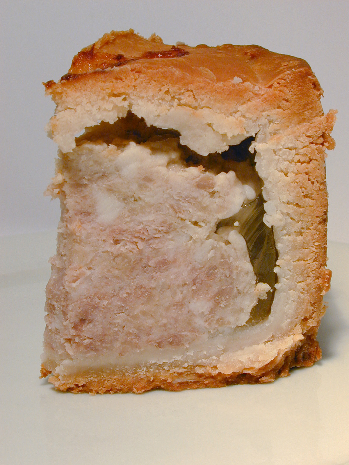 Image Description: Sliced cold pork pie showing the texture of the seasoned minced meat surrounded with jelly and a pastry case and crust