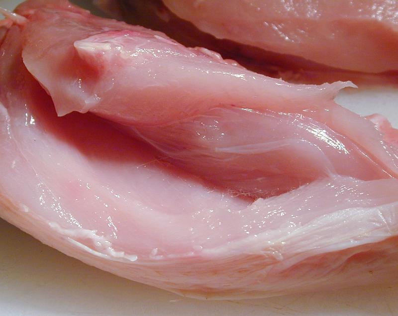 Image Description: Texture of raw lean chicken meat with a close up view of a fillet with the skin removed ready for cooking