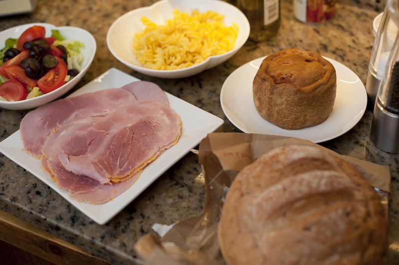 Image Description: Country meal with ham, salads and a cold pork pie served with a loaf of fresh bread on a rustic table