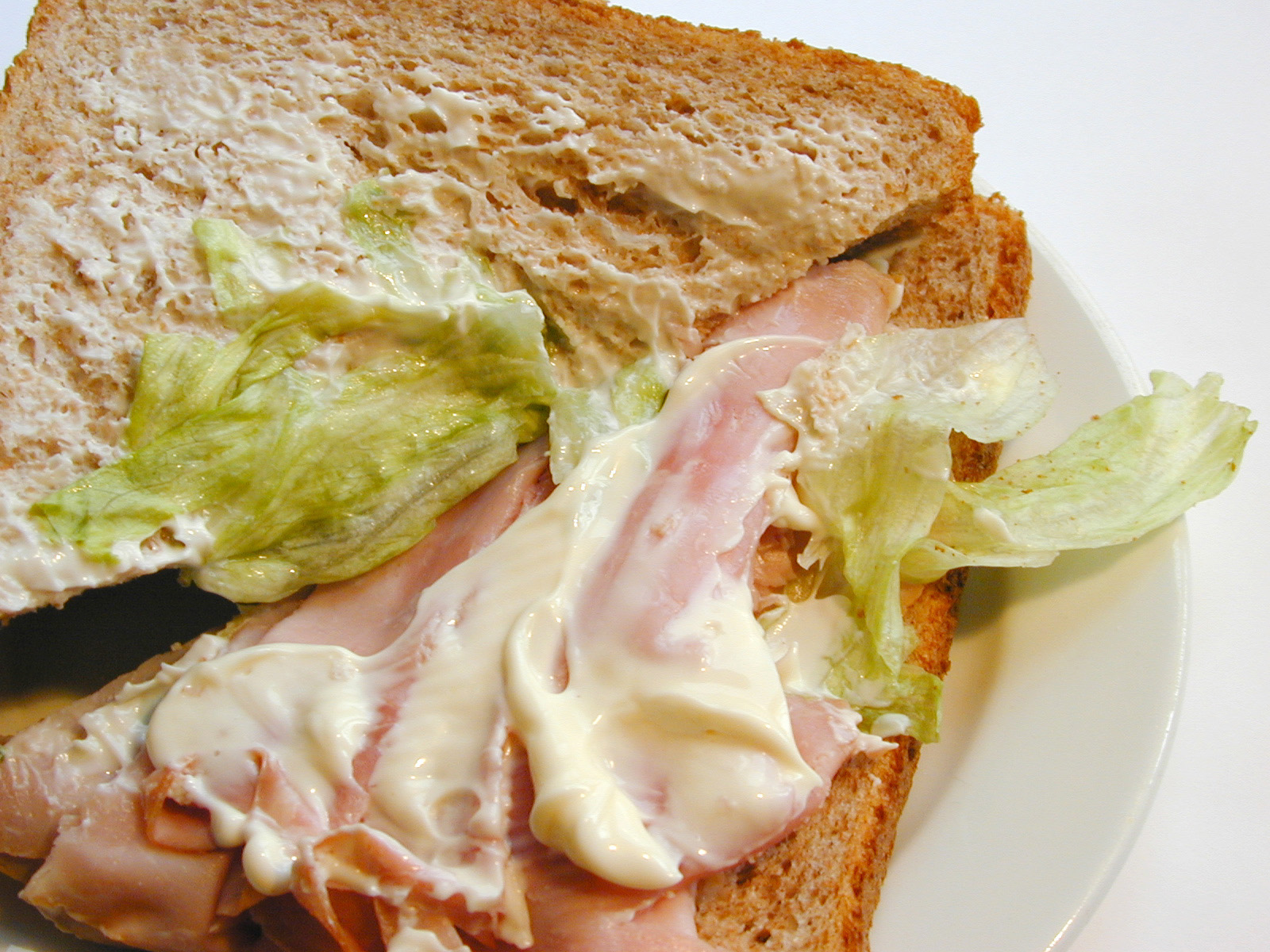 Image Description: Preparing a sandwich for lunch with thinly sliced ham and lettuce on brown bread, closeup view