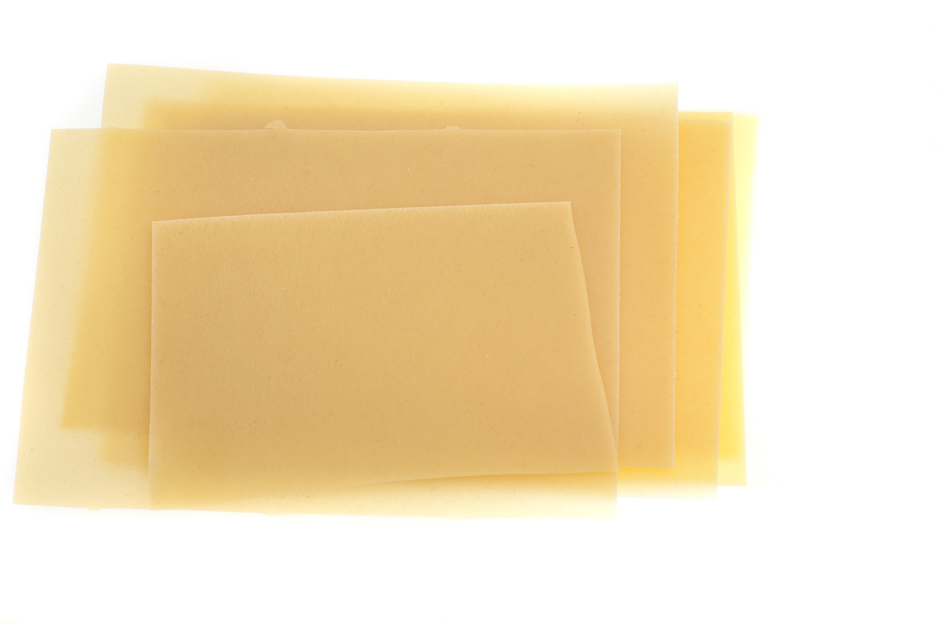 Image Description: Dried sheets of uncooked Italian lasagne pasta made from durum wheat on a white background