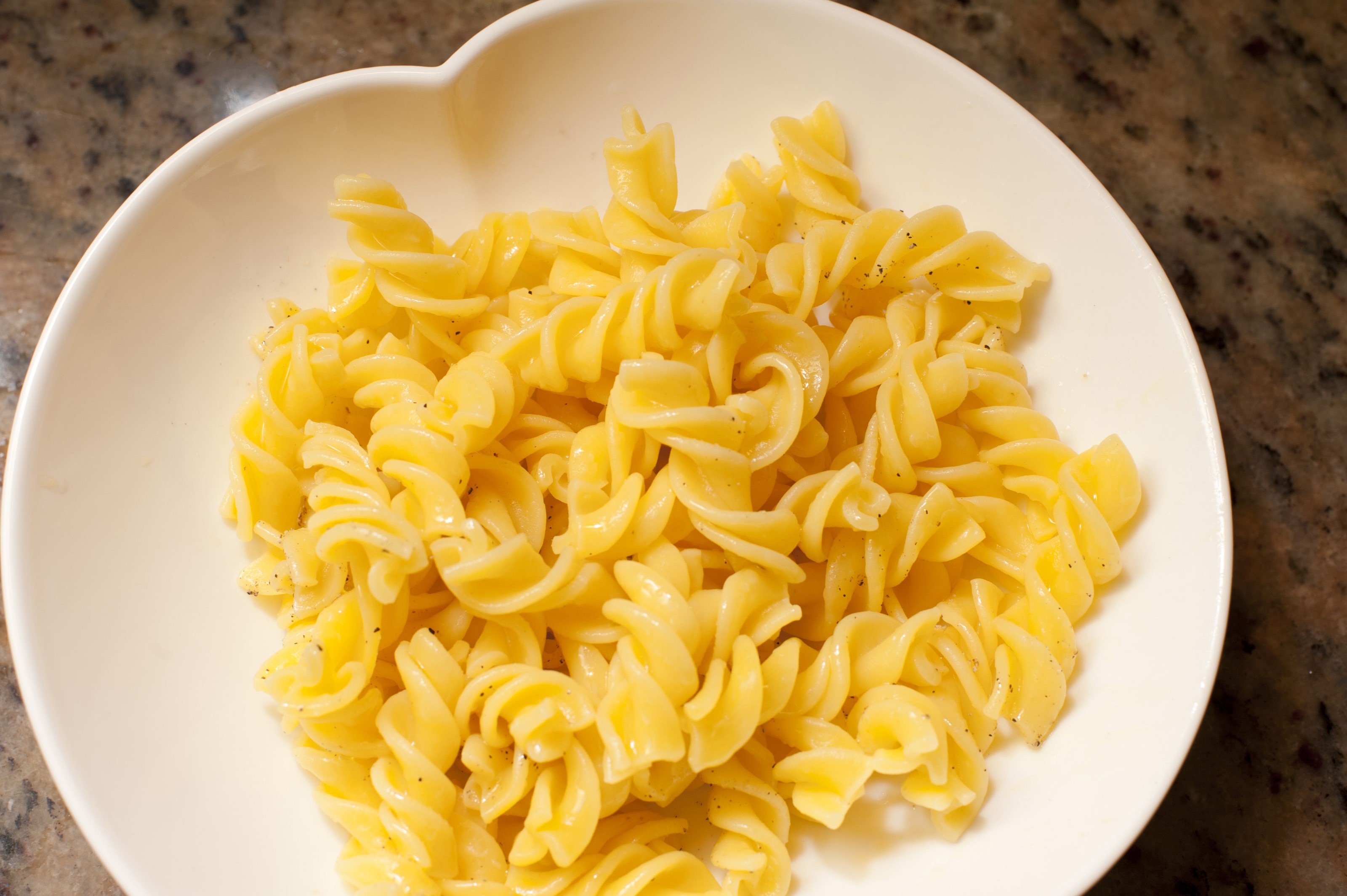 Image Description: Plate of cooked spiral Italian pasta ready for the addition of a tasty savory sauce and parmesan cheese