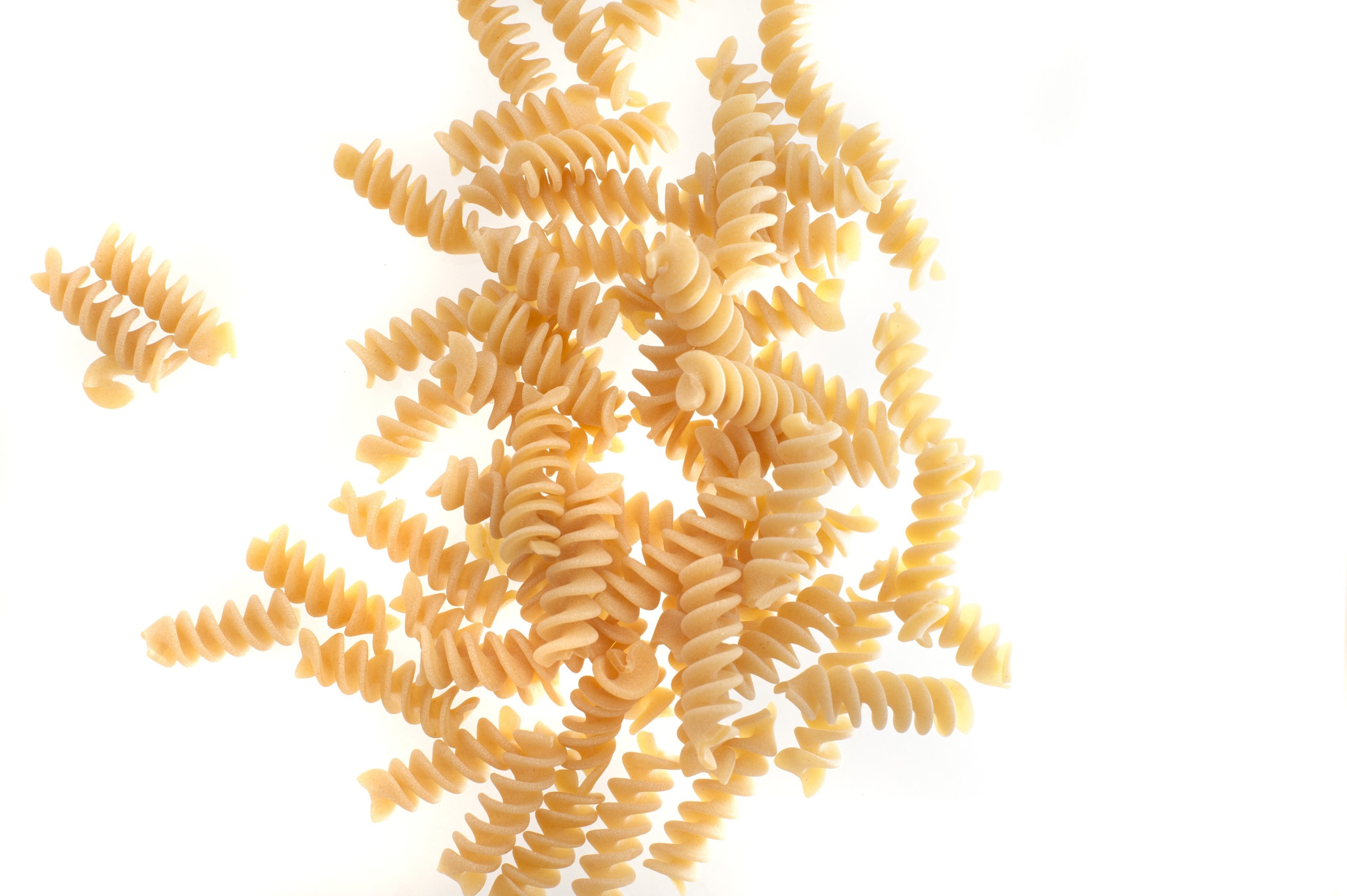 Image Description: Spiral twist uncooked dried Italian pasta scattered on a white background with copyspace viewed from above