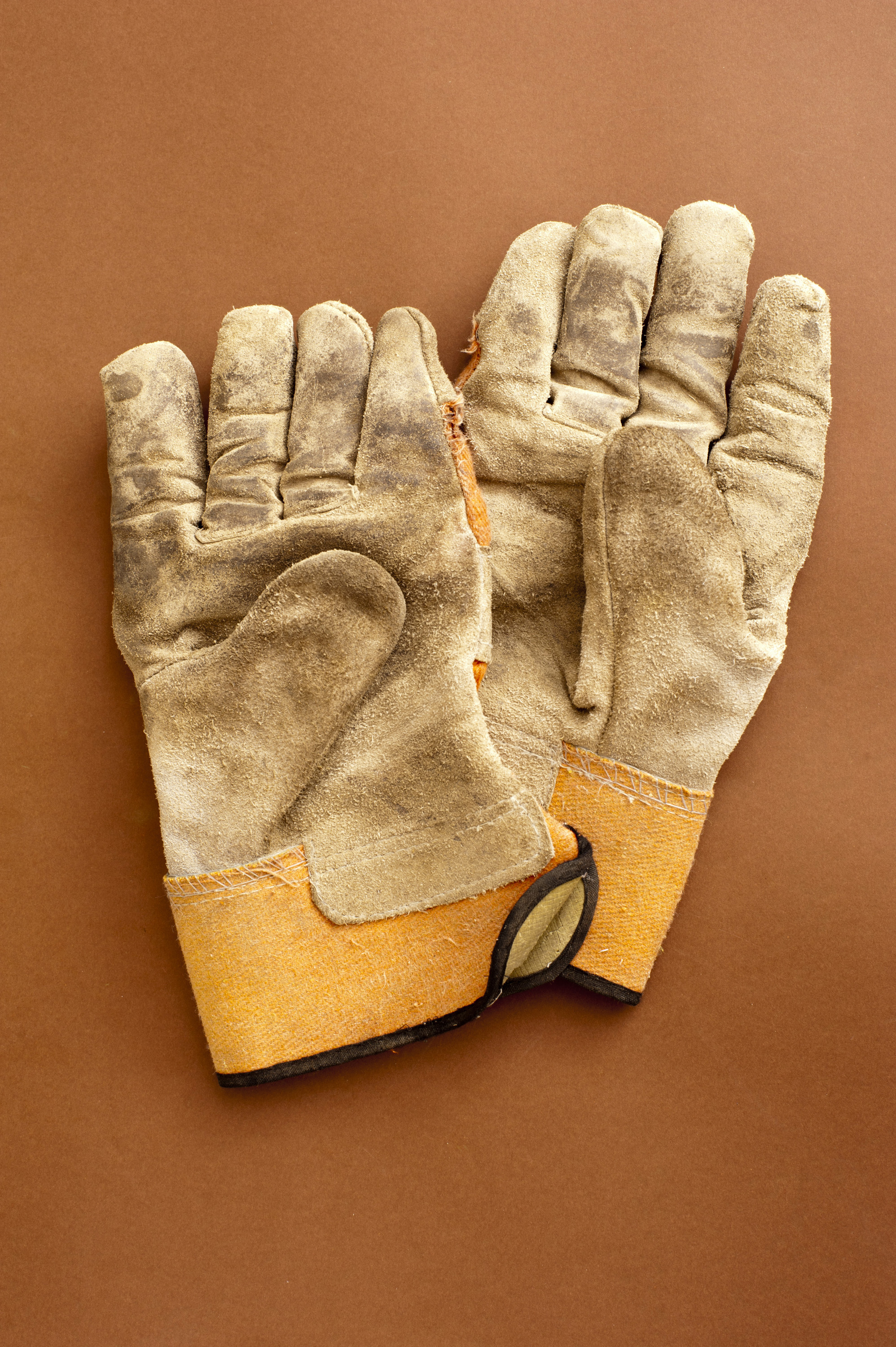 Image Description: Pair of used gardening gloves lying on a brown background, overhead view