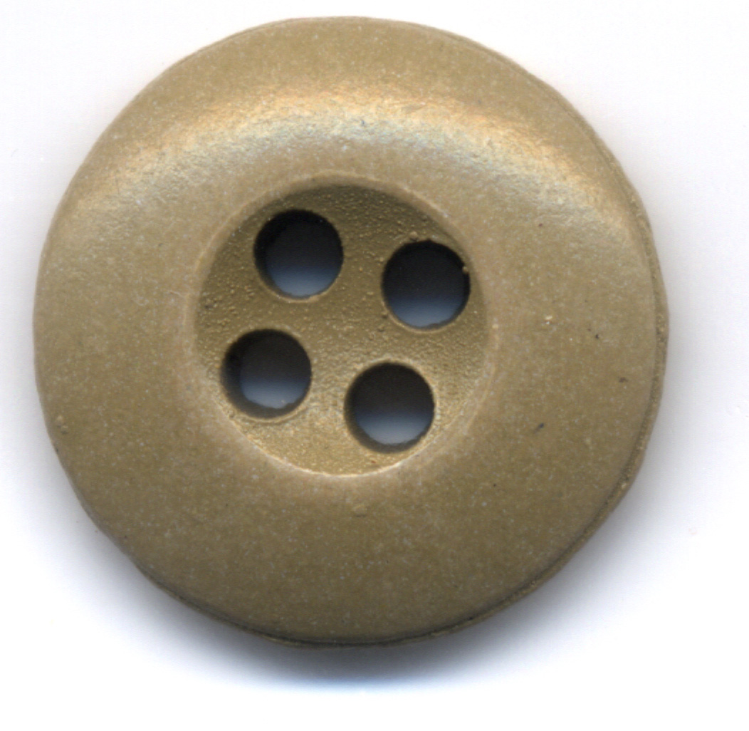 Image Description: Macro Close Up of Beige Gold Colored Button with Four Holes on White Background