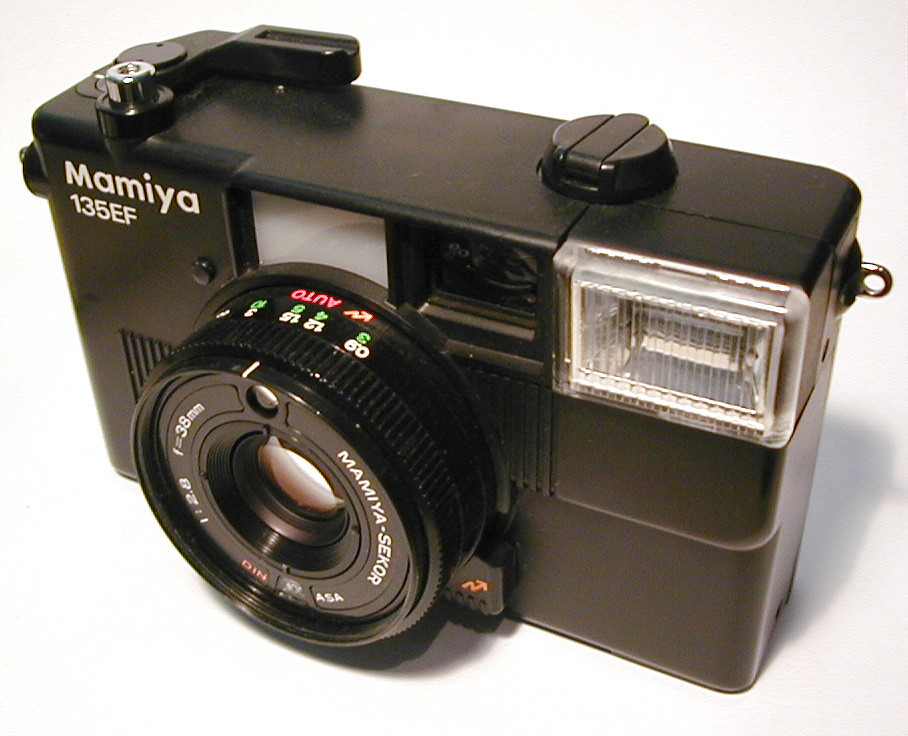 Image Description: High Angle View of Historical Mamiya 135EF Manual Point and Shoot Camera, an Obsolete Film Camera, on White Background