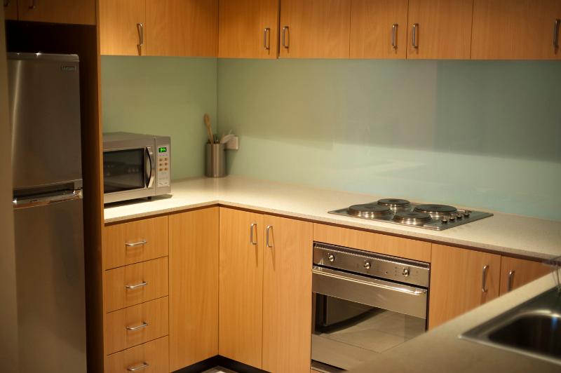 Image Description: Neat clean kitchen with a built in under counter oven, microwave and wooden cabinetry