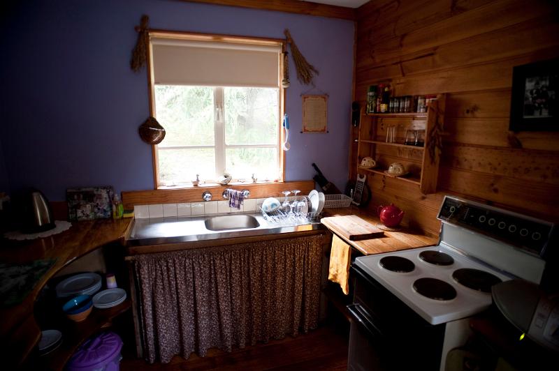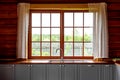 Image Description: Interior of a cottage kitchen with rustic wooden countertops and curtained units