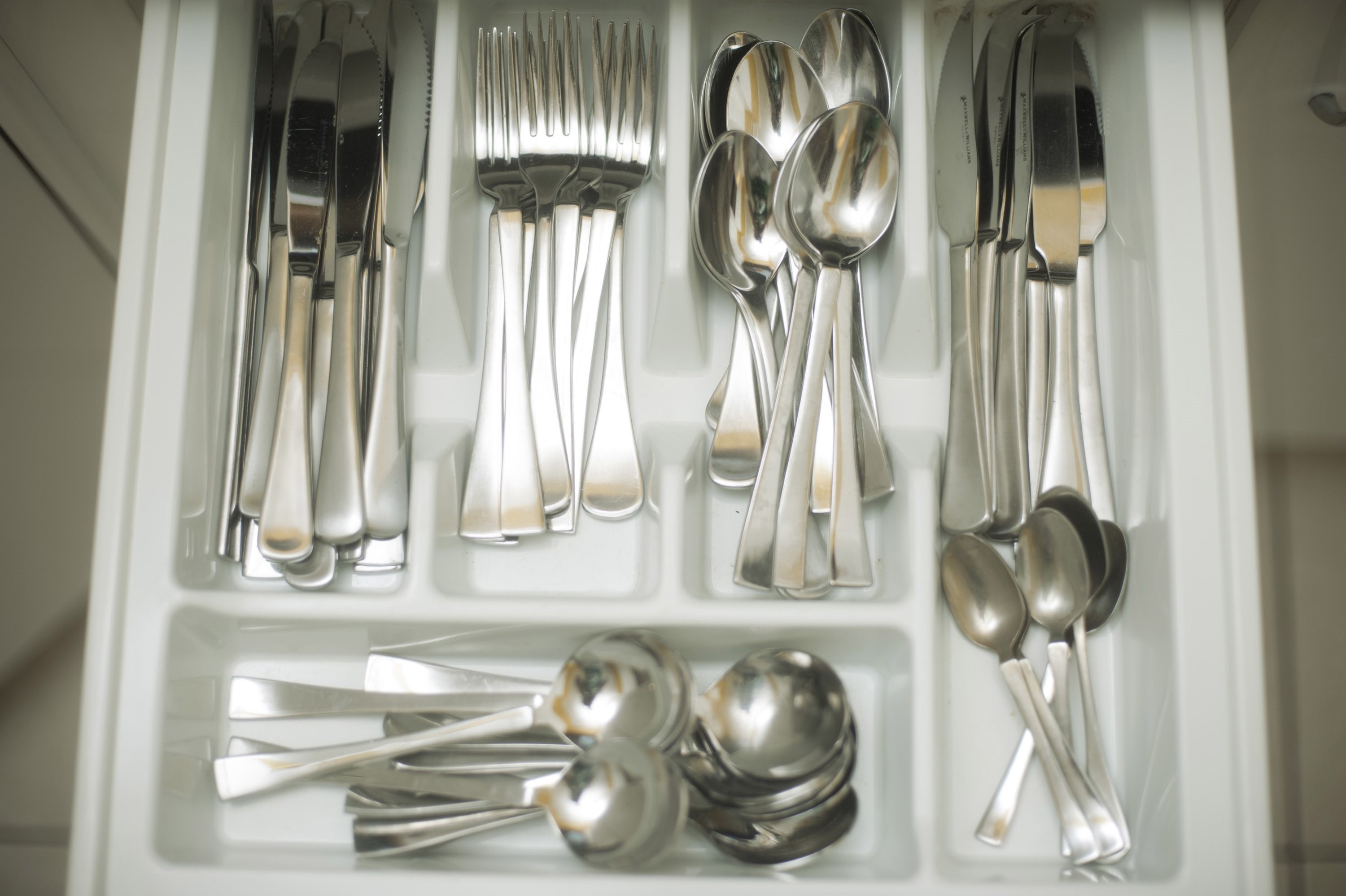 Image Description: Open cutlery drawer with an inside divided tray for neat storage of silver metal knives, forks, spoons and teaspoons