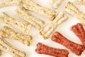 Image Description: Closeup of two bone shaped dog biscuits providing a healthy nutrition for your pet on a white background