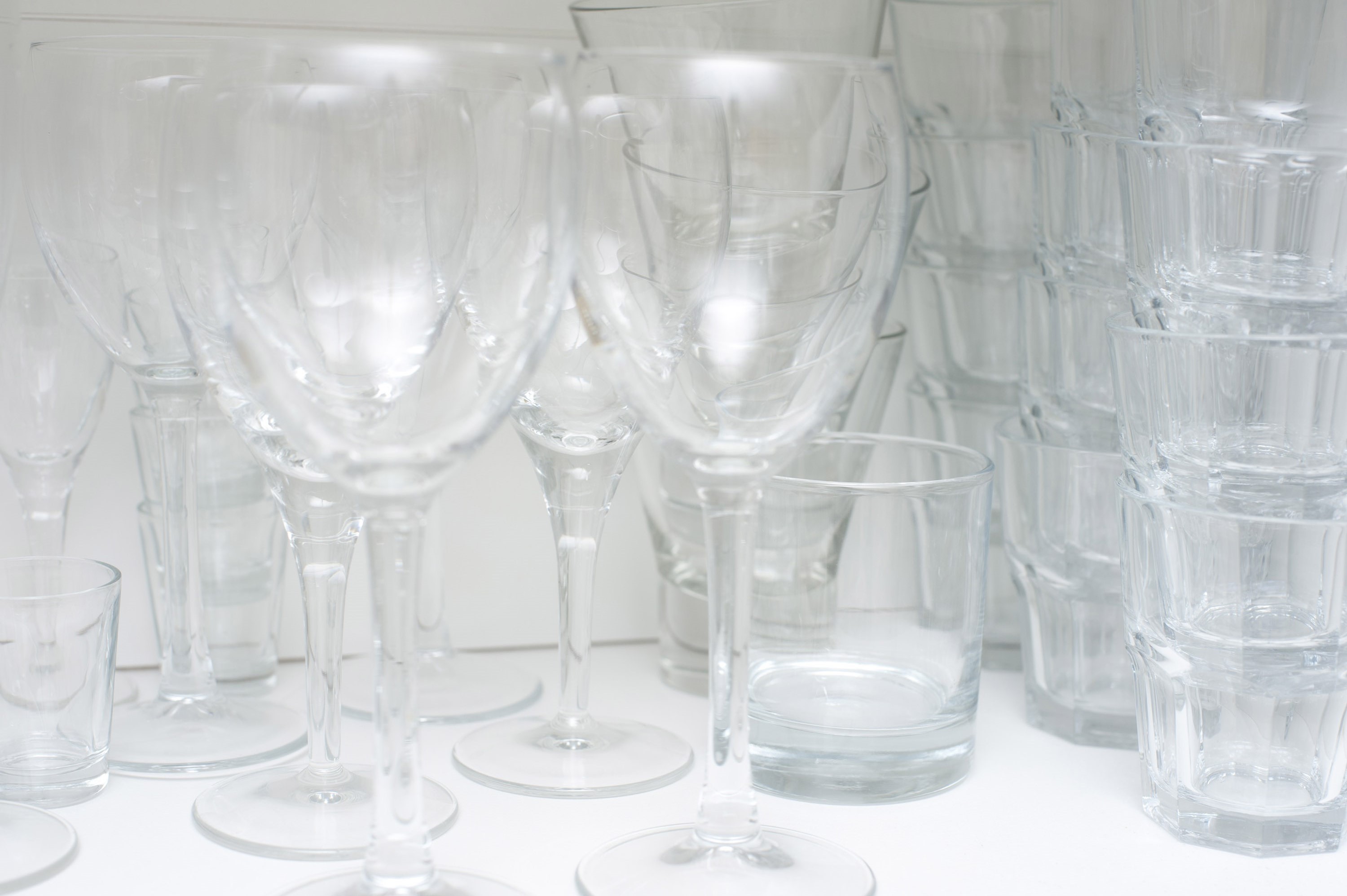 Image Description: Wine and water glasses on a shelf in a white cupboard