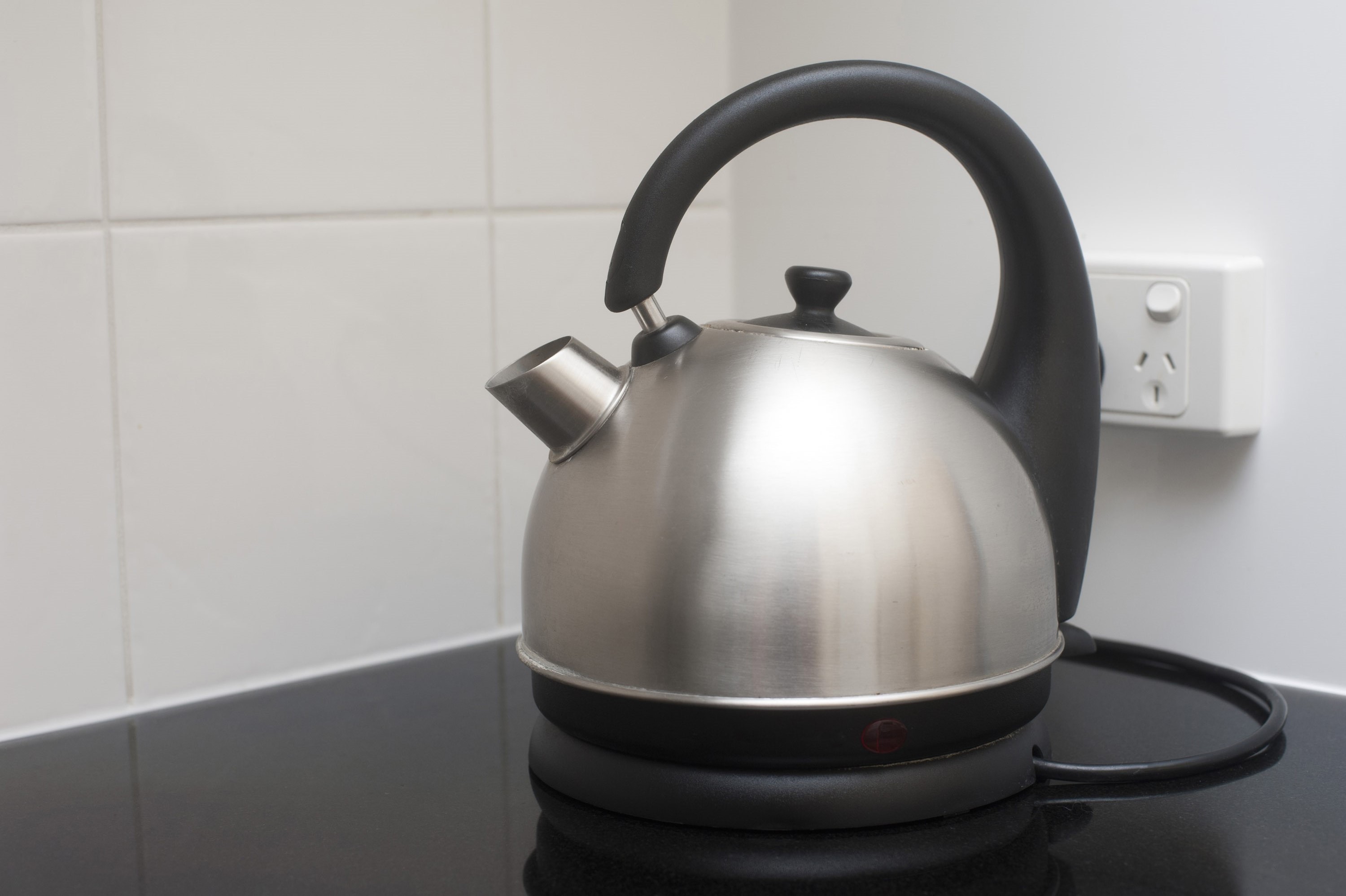 Image Description: Modern silver metal cordless domed domestic kettle standing on its base on a kitchen countertop