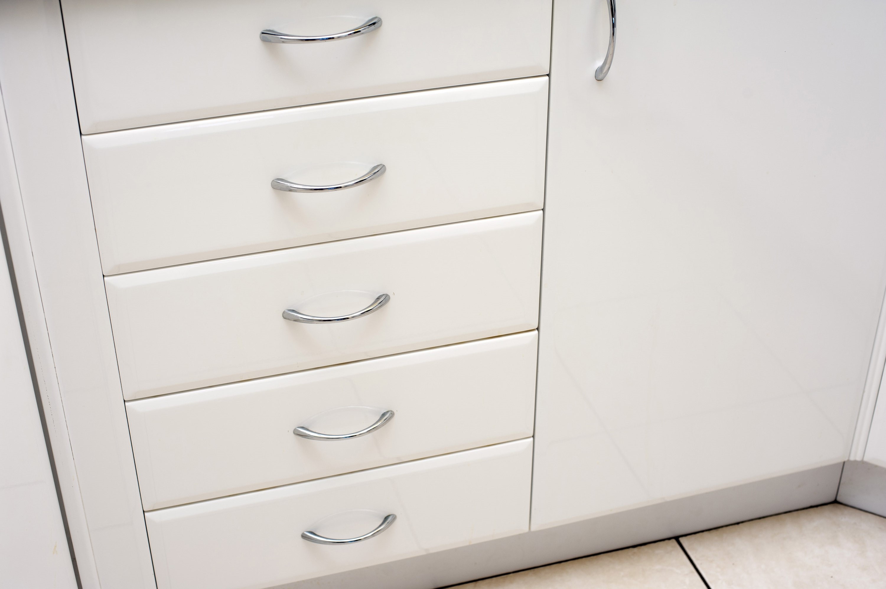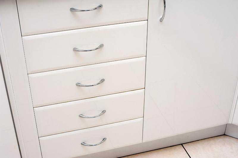 Image Description: White kitchen cabinet with a row of closed drawers and a cupboard door
