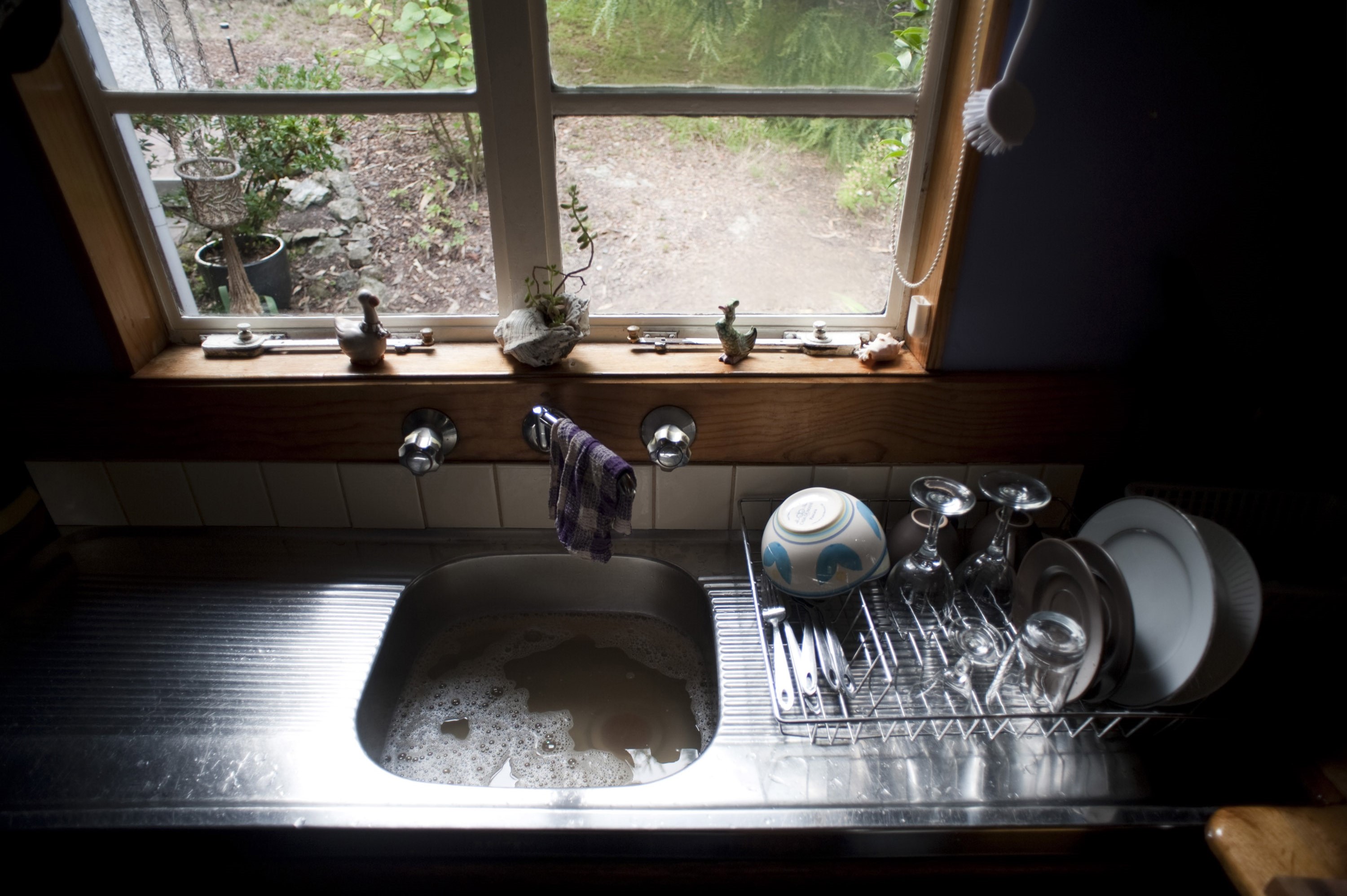 Image Description: View of a stainles steel kitchen sink with dirty water and washing up on the side in the shadows in front of a window overlooking a back garden
