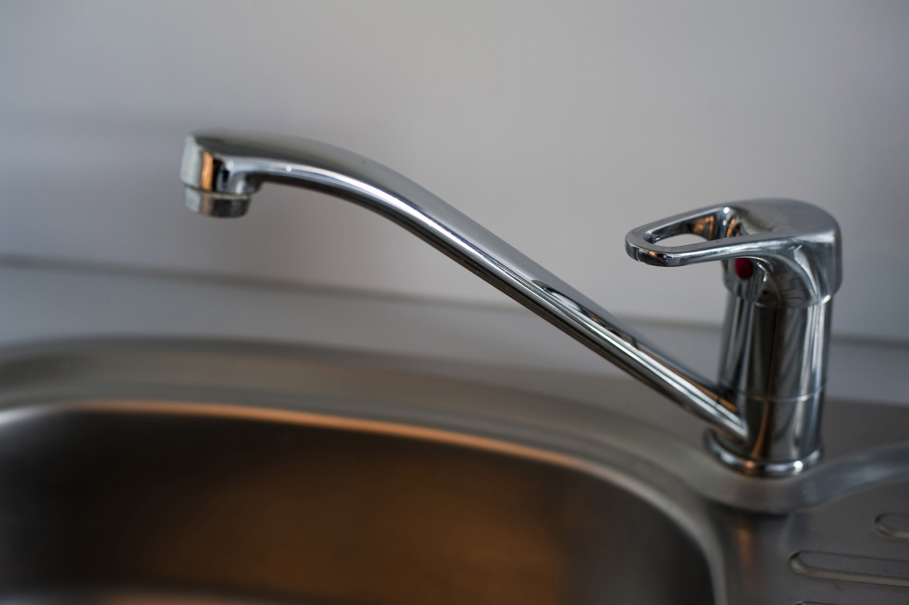 Image Description: Detail of a modern chrome mono block kitchen tap over a stainless steel kitchen sink