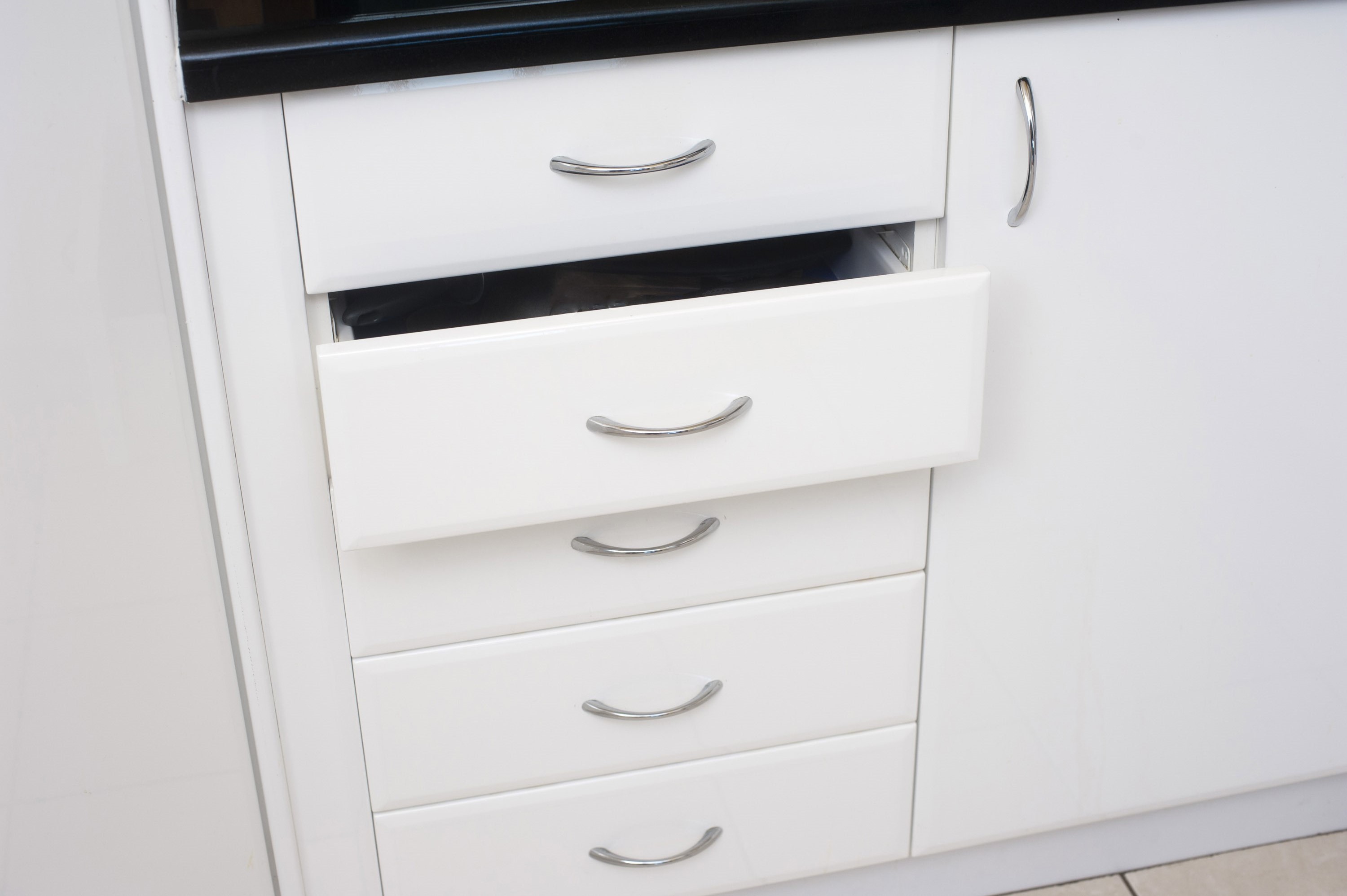 Image Description: Set of white kitchen drawers in a built in cabinet unit with one drawer slightly open