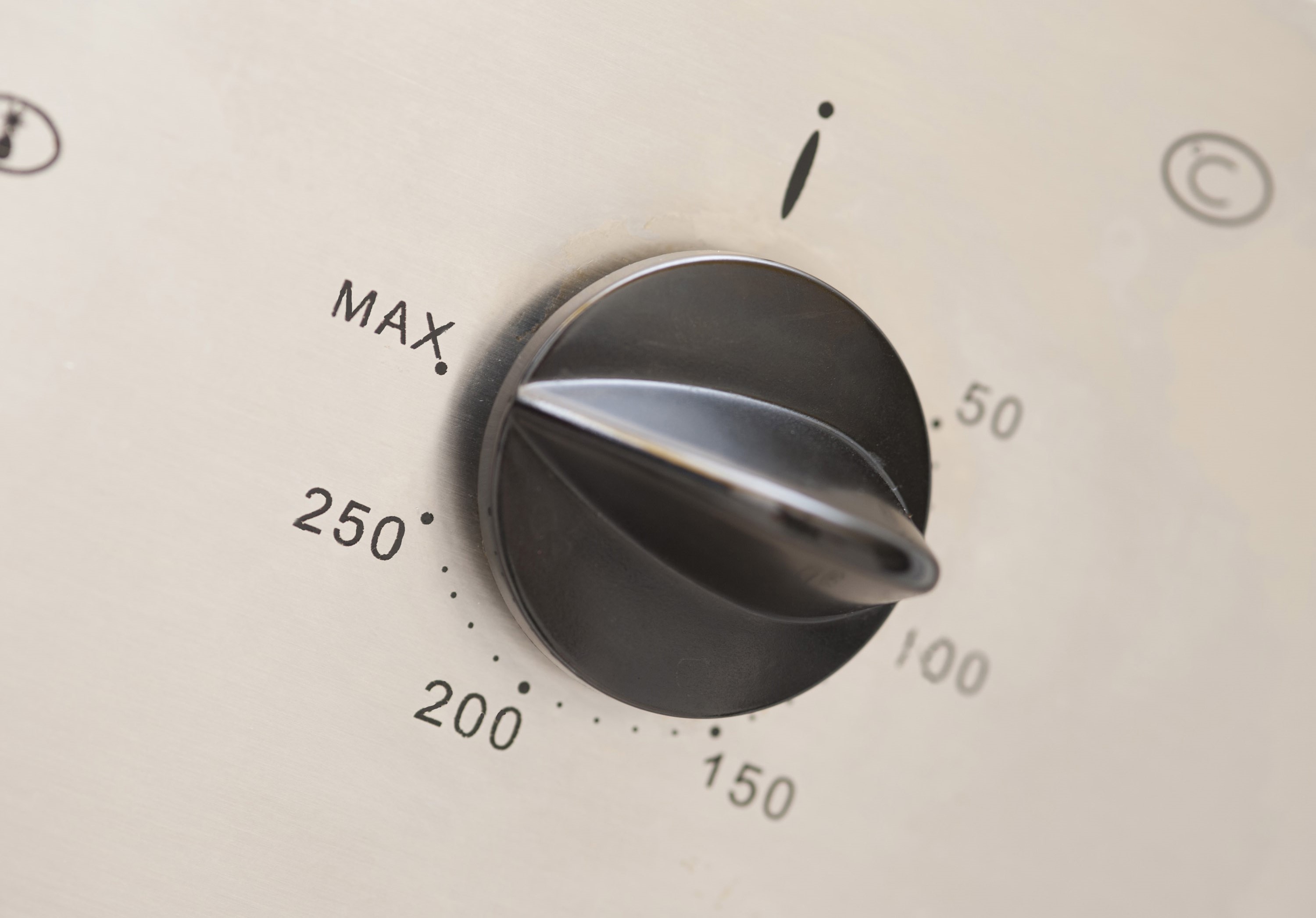 Image Description: Closeup of a plastic oven thermostat dial for controlling the temperature of the appliance during the cooking of food