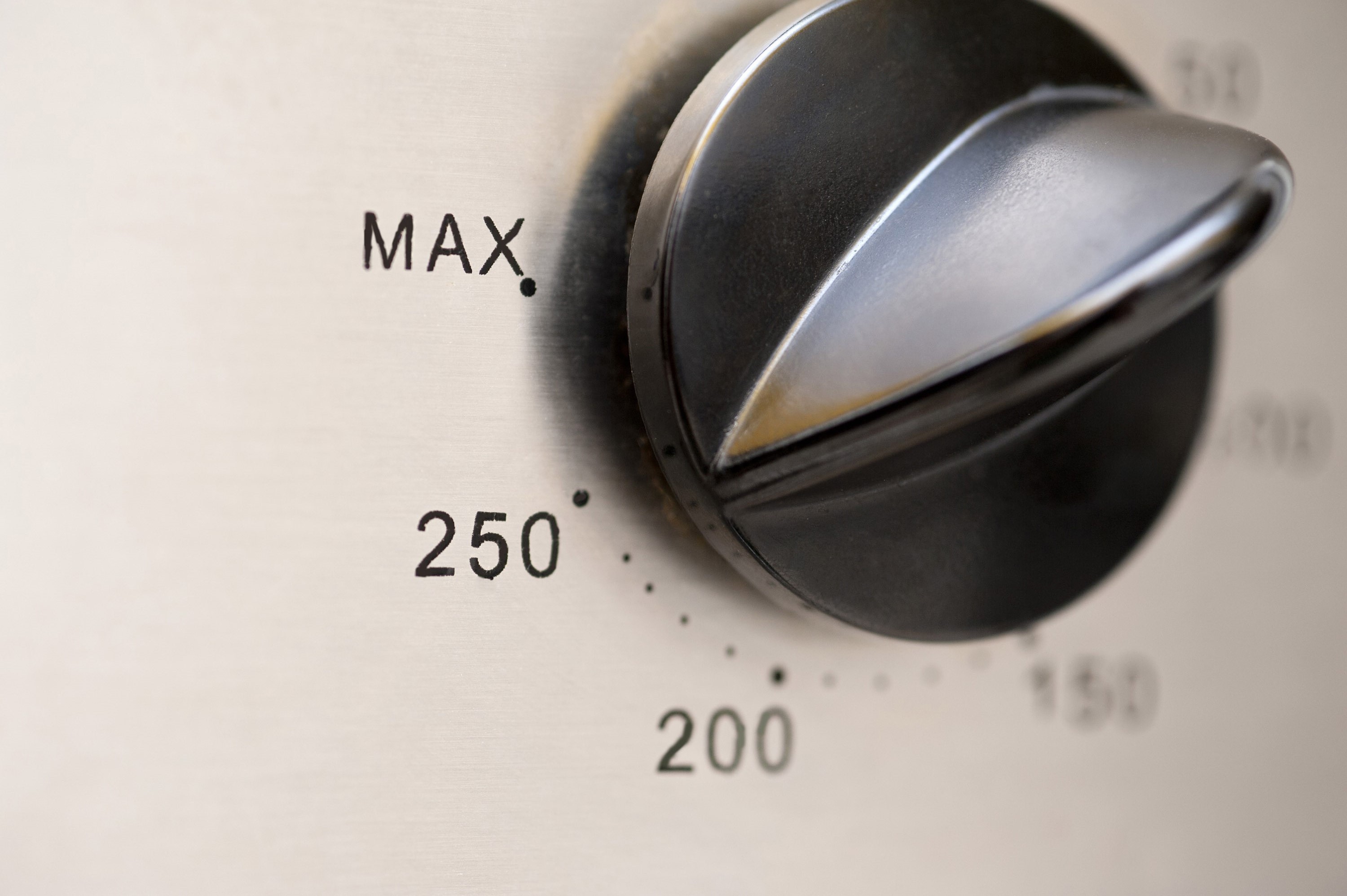 Image Description: Closeup of a circular oven thermostat control knob with various temperature settings for cooking