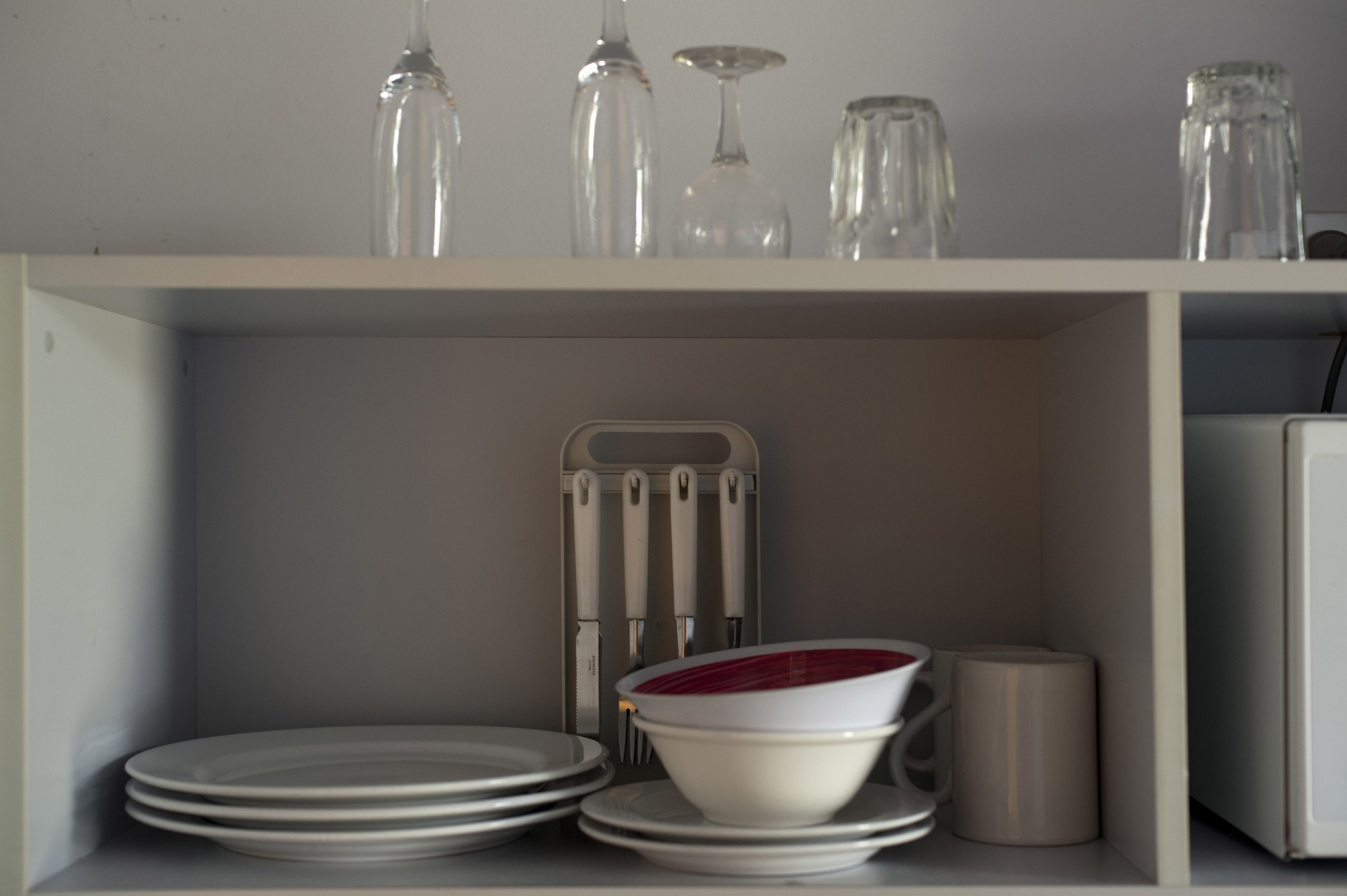 Image Description: A variety of ceramic plates, mugs and bowls on a kitchen shelf together with some glasses stored above
