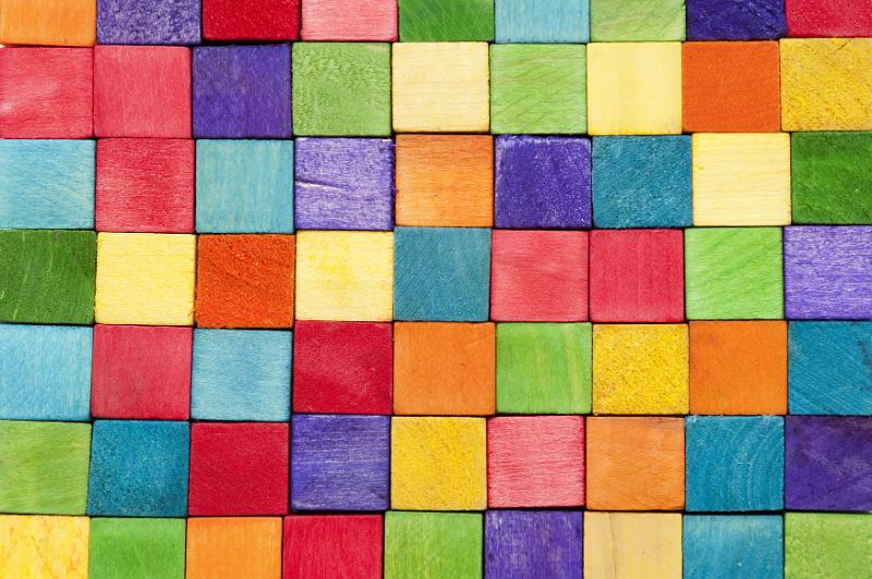 Image Description: Background pattern of colorful toy wooden blocks or cubes in the colors of the rainbow neatly arranged in rows