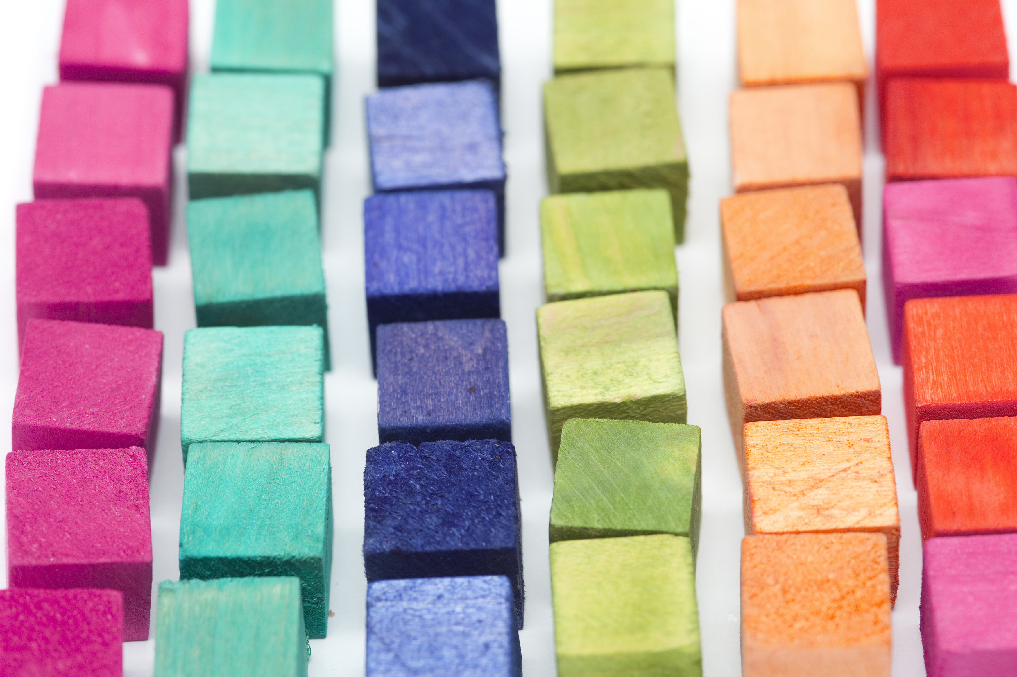Image Description: High Angle Still Life of Rows of Multi-Colored Wooden Cube Blocks Arranged in Rows by Color Hue on White Background