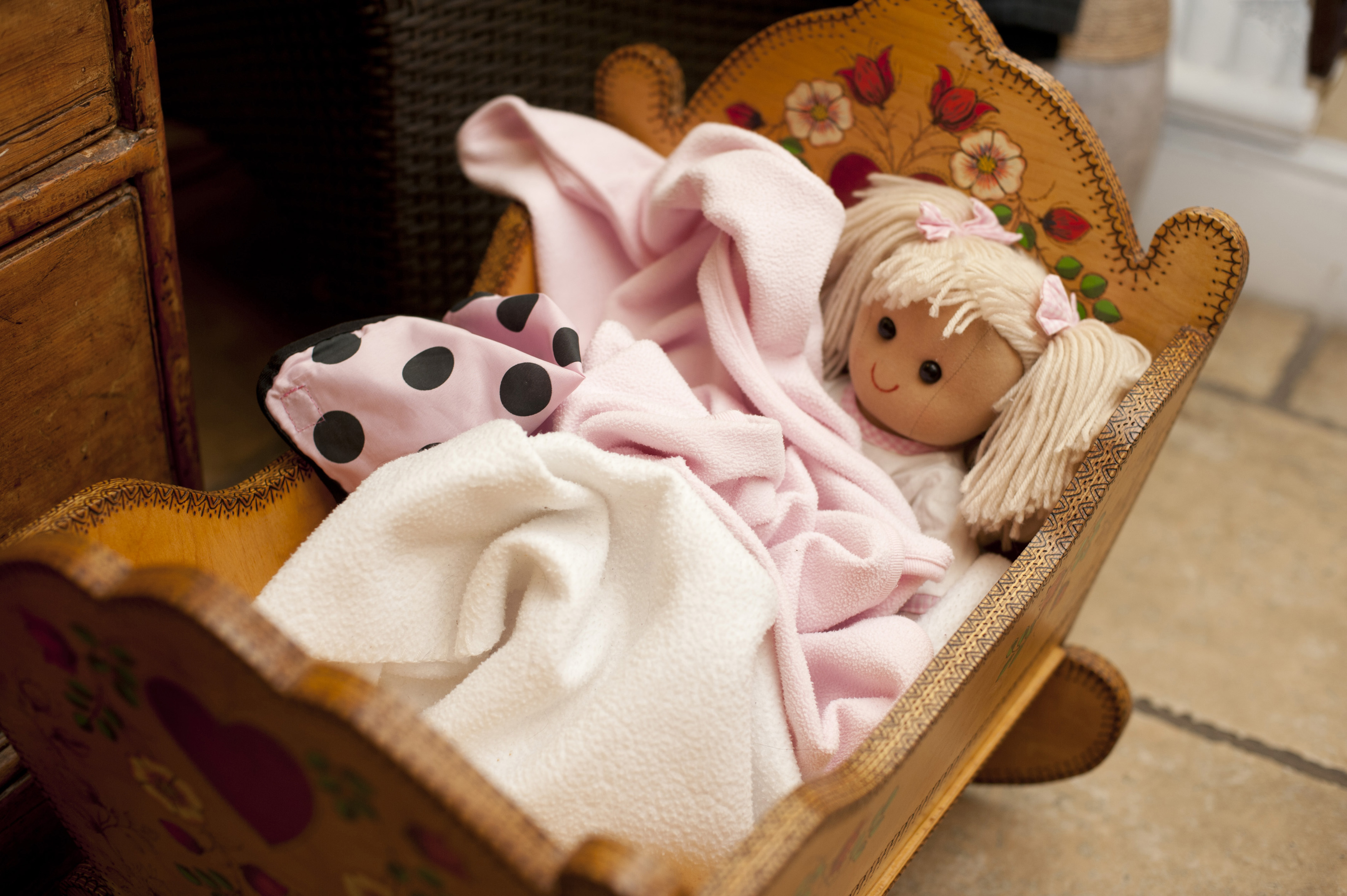 Image Description: Tight view of cute little blond doll wrapped in blankets laying down in wooden crib on floor