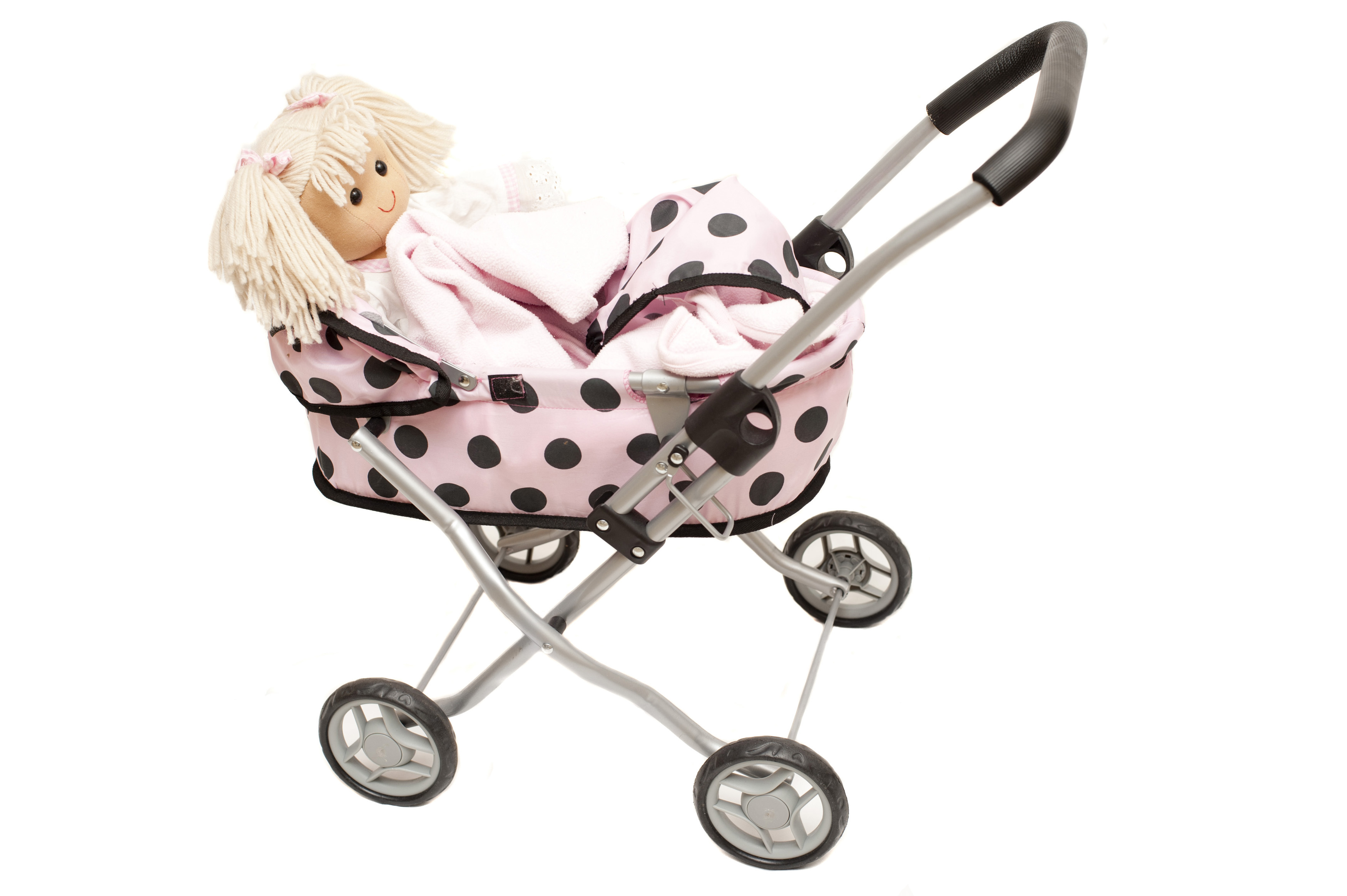 Image Description: Little blond doll in a kids pink toy pram or stroller with black polka dots isolated on white