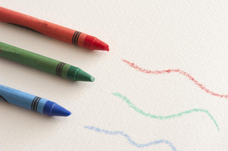 Image Description: Green, red and blue colored wax crayons with squiggly hand drawn lines over textured paper viewed high angle