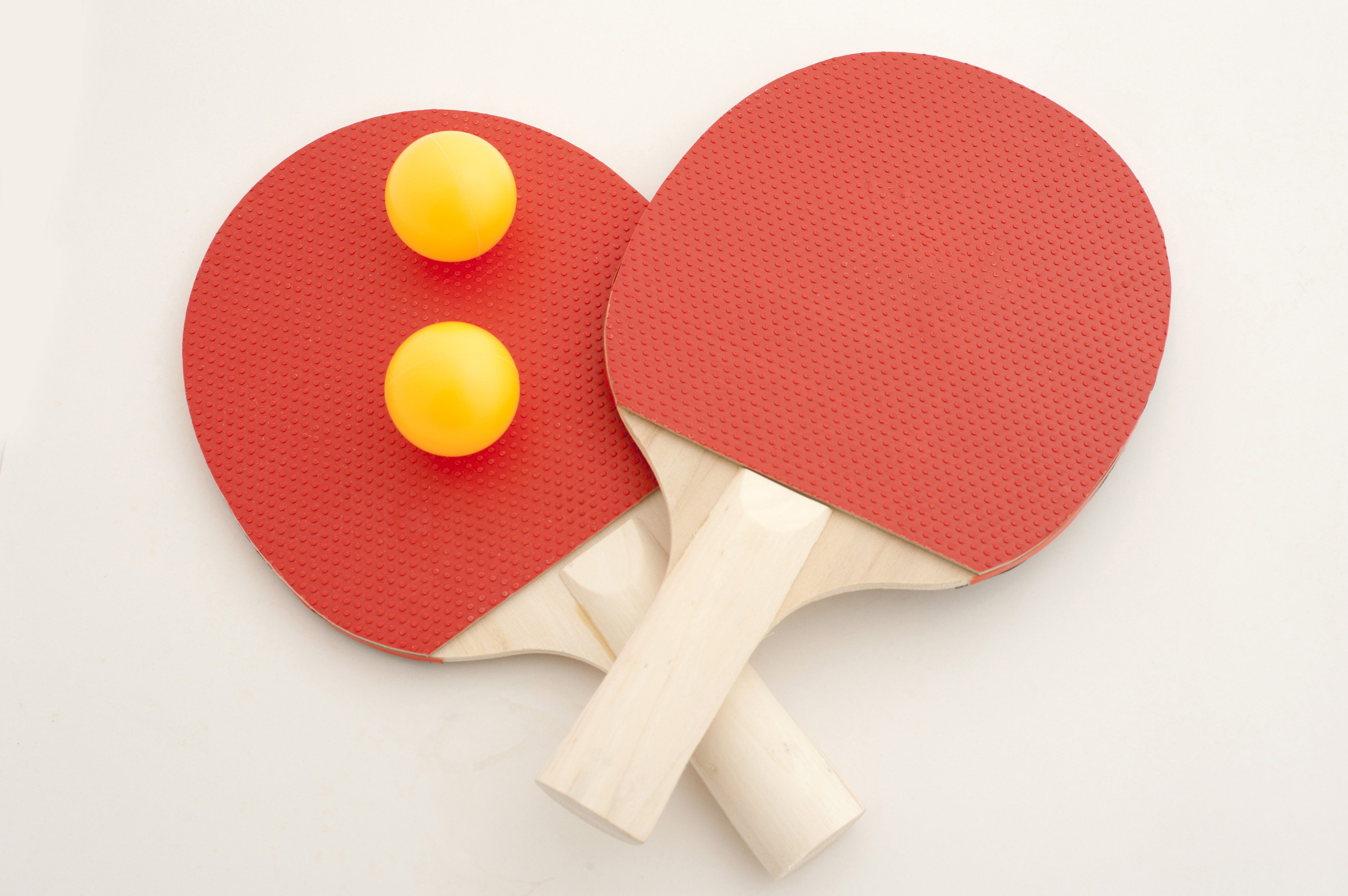 Image Description: Two red wooden ping pong or table tennis bats with luminous yellow balls crossing over on a white background viewed from above