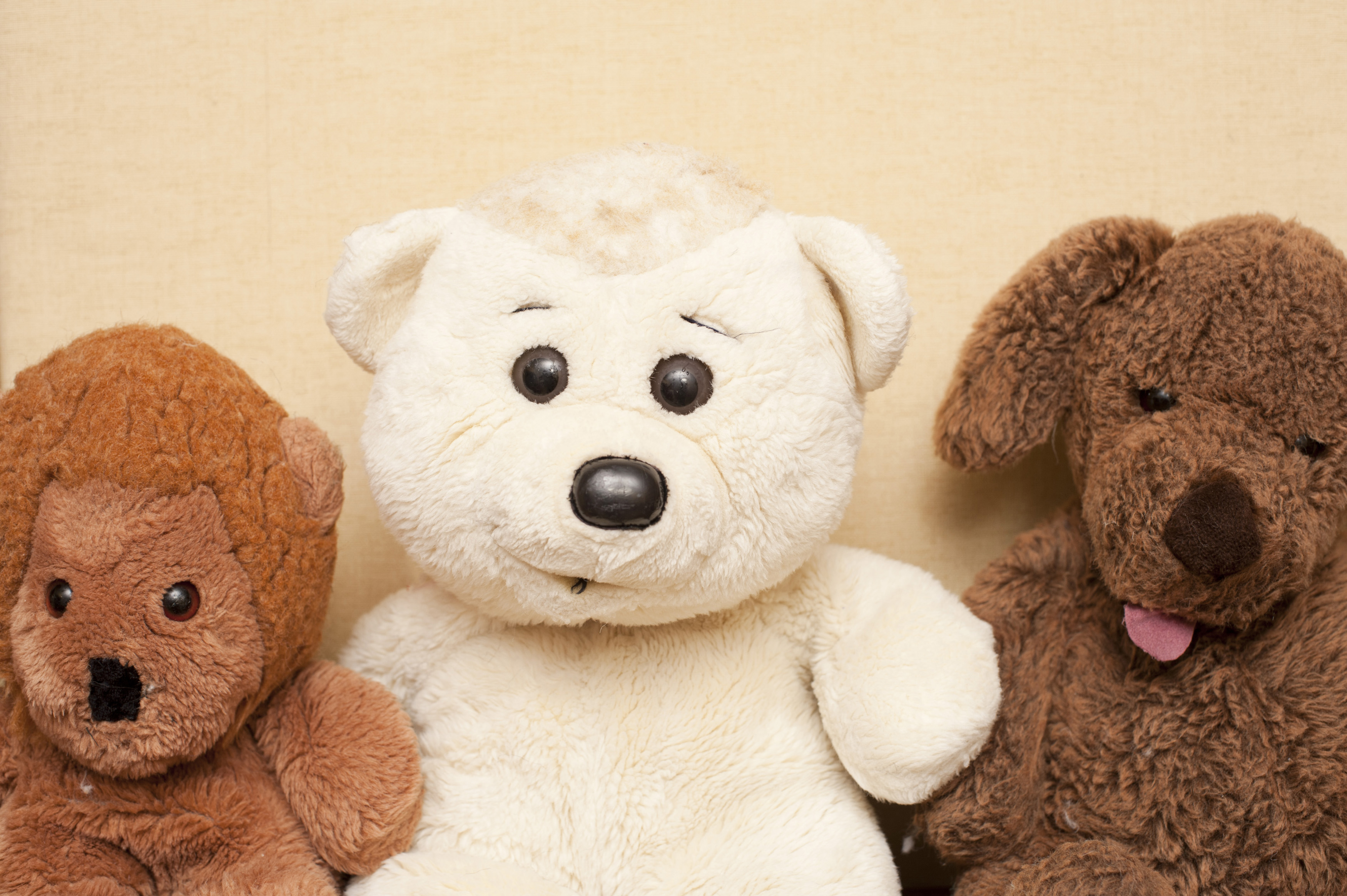 Image Description: Three different cute soft cuddly soft plush toy bears with a white polar bear in the center, close up of their faces in a row against a wall