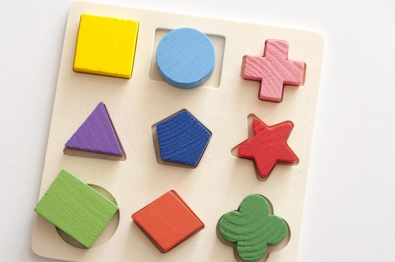 Image Description: High Angle Still Life View of Simple Wooden Toy for Child with a Variety of Shapes for Matching on Board in Studio with White Background and Copy Space