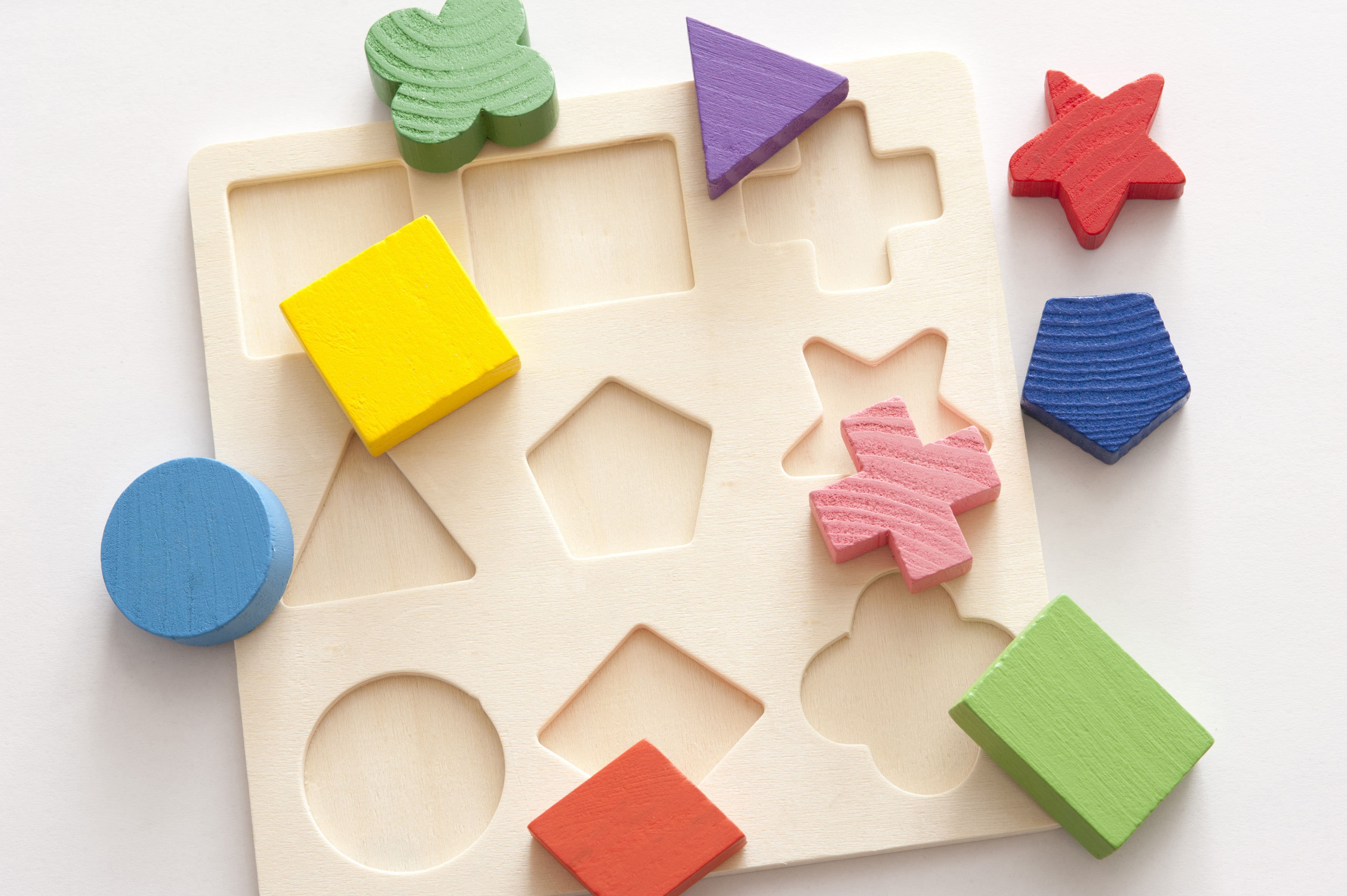 Image Description: Close up of various shaped scattered puzzle block pieces scattered over template on gray background
