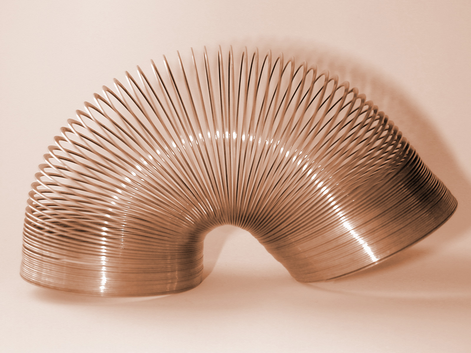 Image Description: Old retro brown metallic slinky toy spring arched over on itself on an off white background