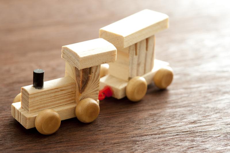 Image Description: Kids wooden toy train made of pine with an engine pulling a single carriage on a wooden table, high angle view