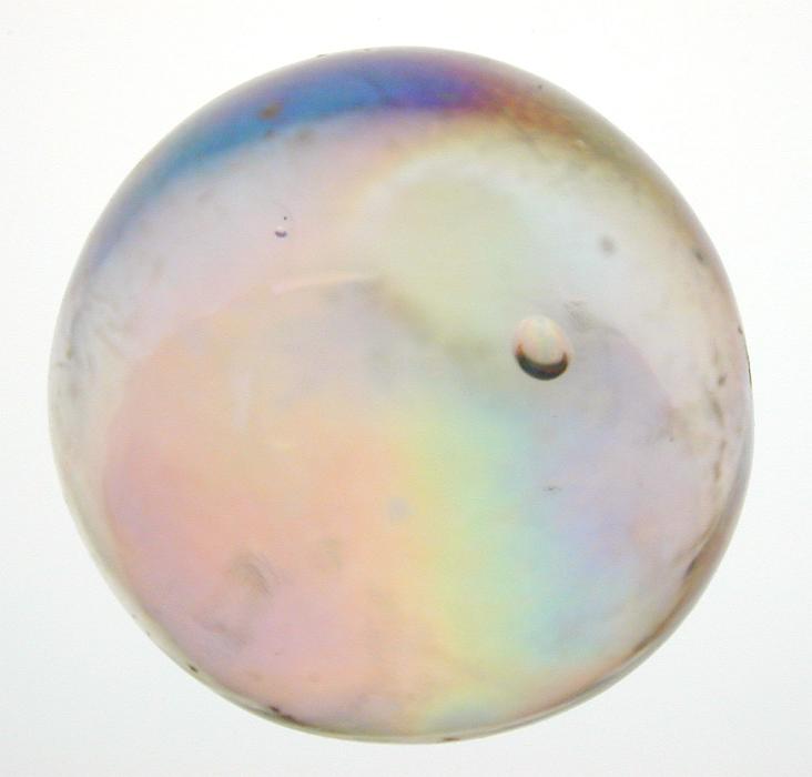 Image Description: Iridescent toy glass marble viewed close up showing the colorful internal refraction of light over white