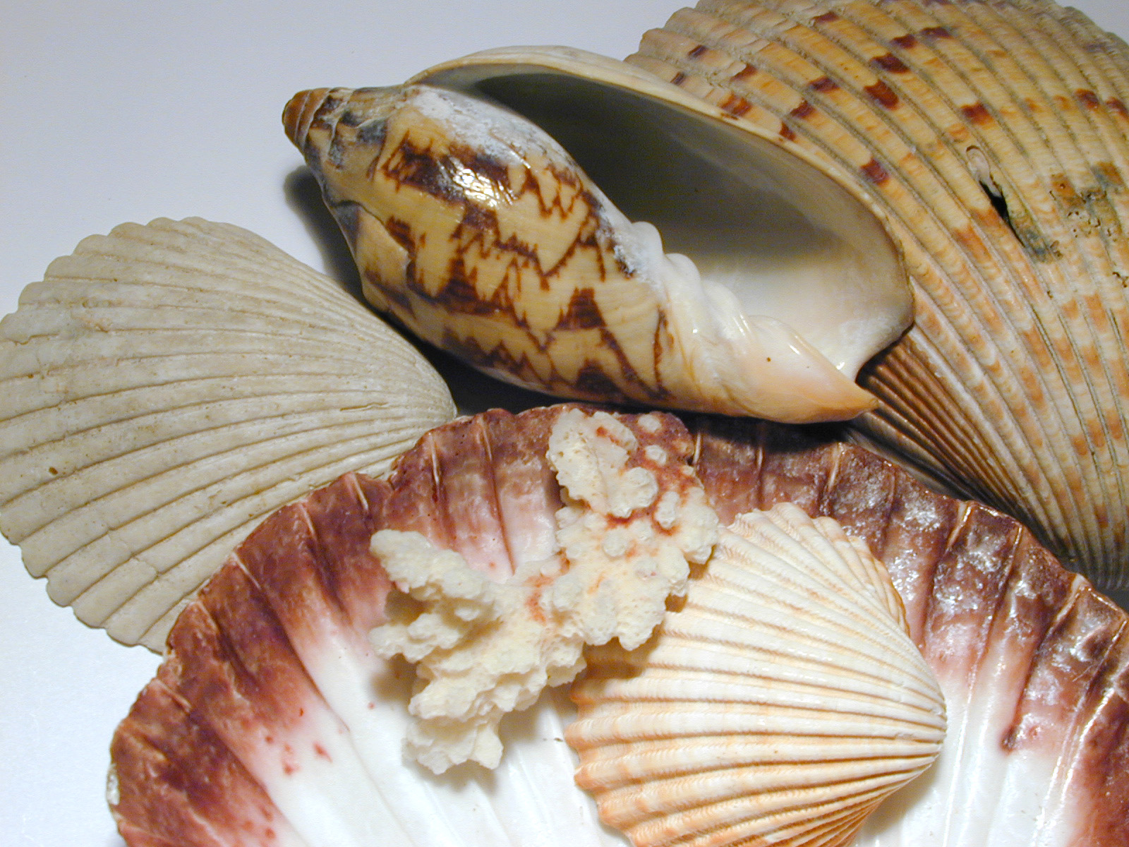 Image Description: Collection of assorted seashells and coral, mementos from a summer vacation at the coast or seaside