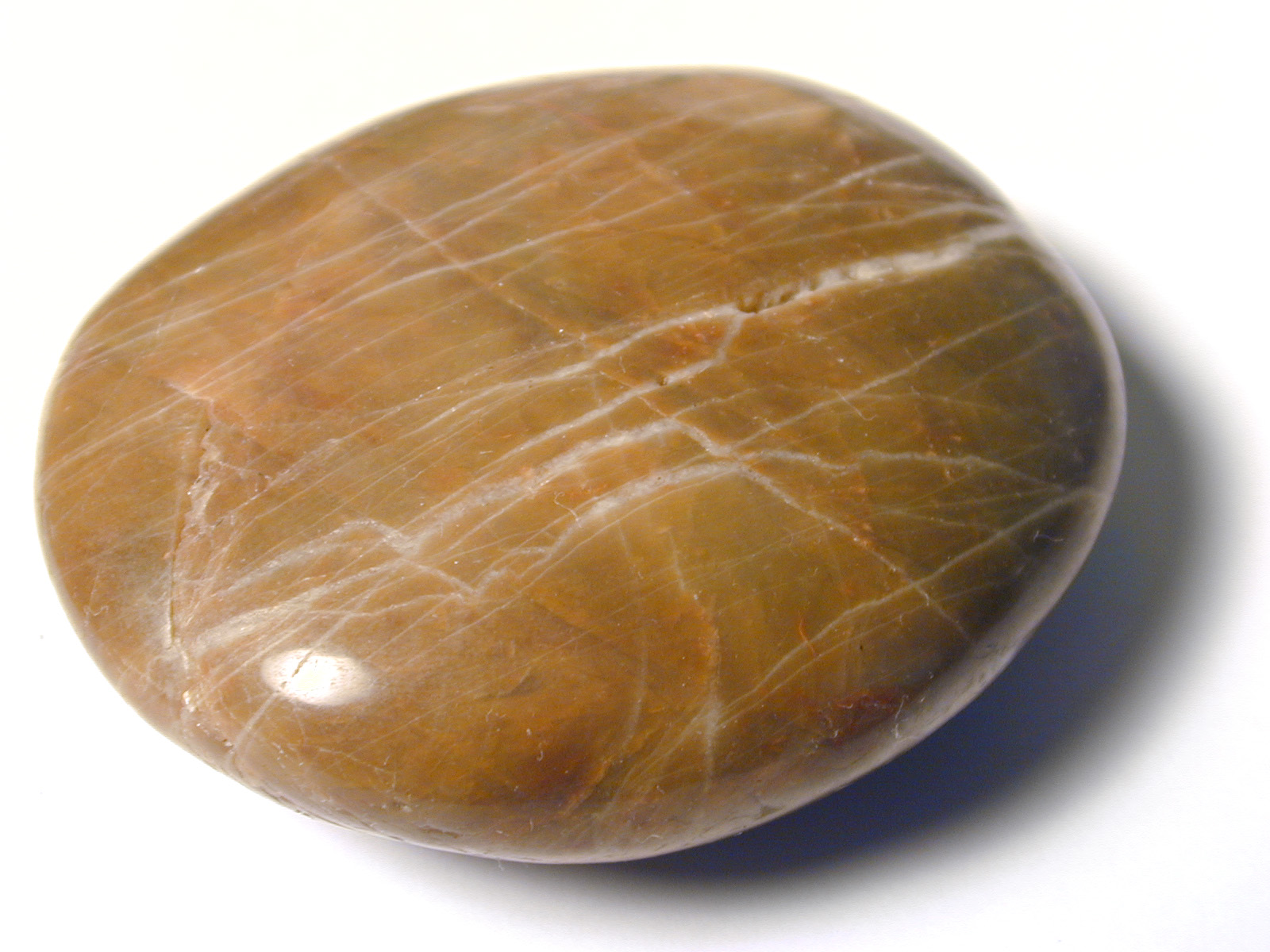 Image Description: Smooth weathered sandstone pebble with white quartzite veins forming an intricate pattern worn smooth by the action of water, on white