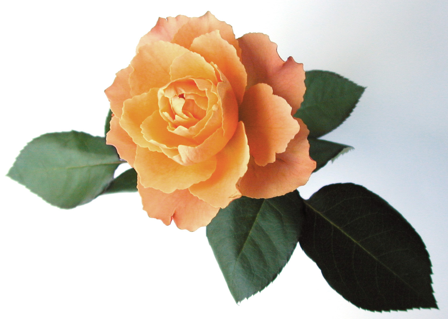 Image Description: Single beautiful delicate orange rose with fresh green leaves on a white background, symbolic of love and romance