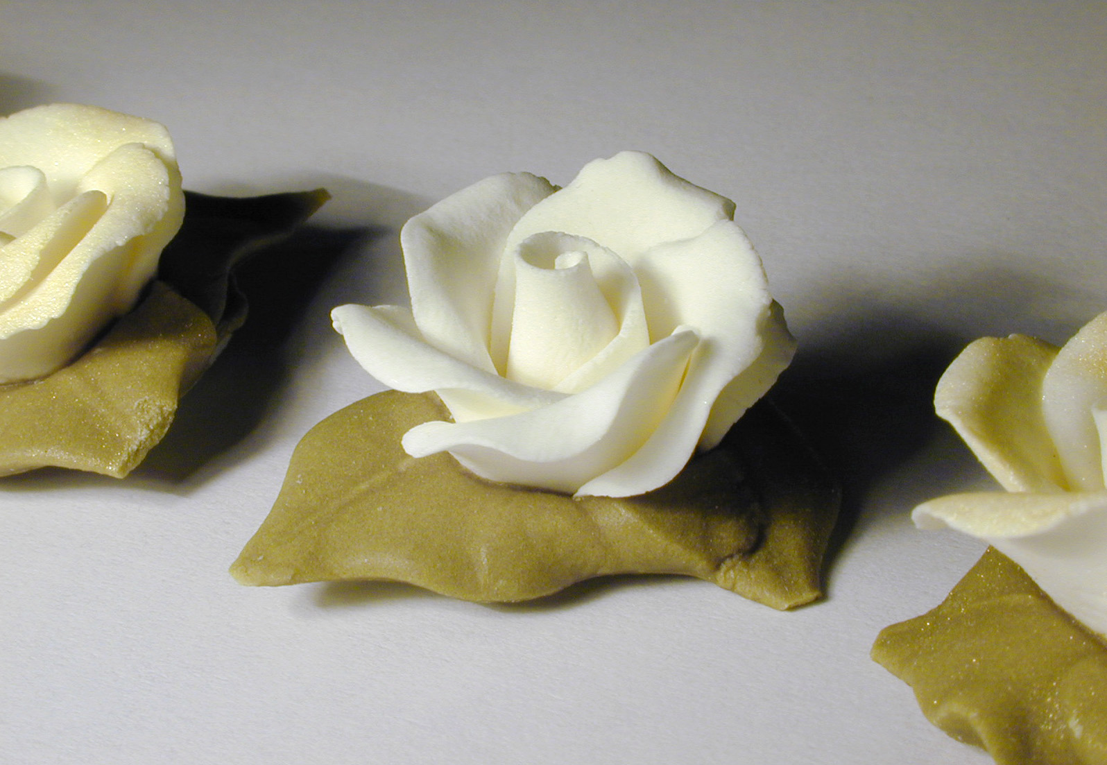 Image Description: Row of Delicate White Rose Flowers Made from Icing for Decorating Cake or Pastries