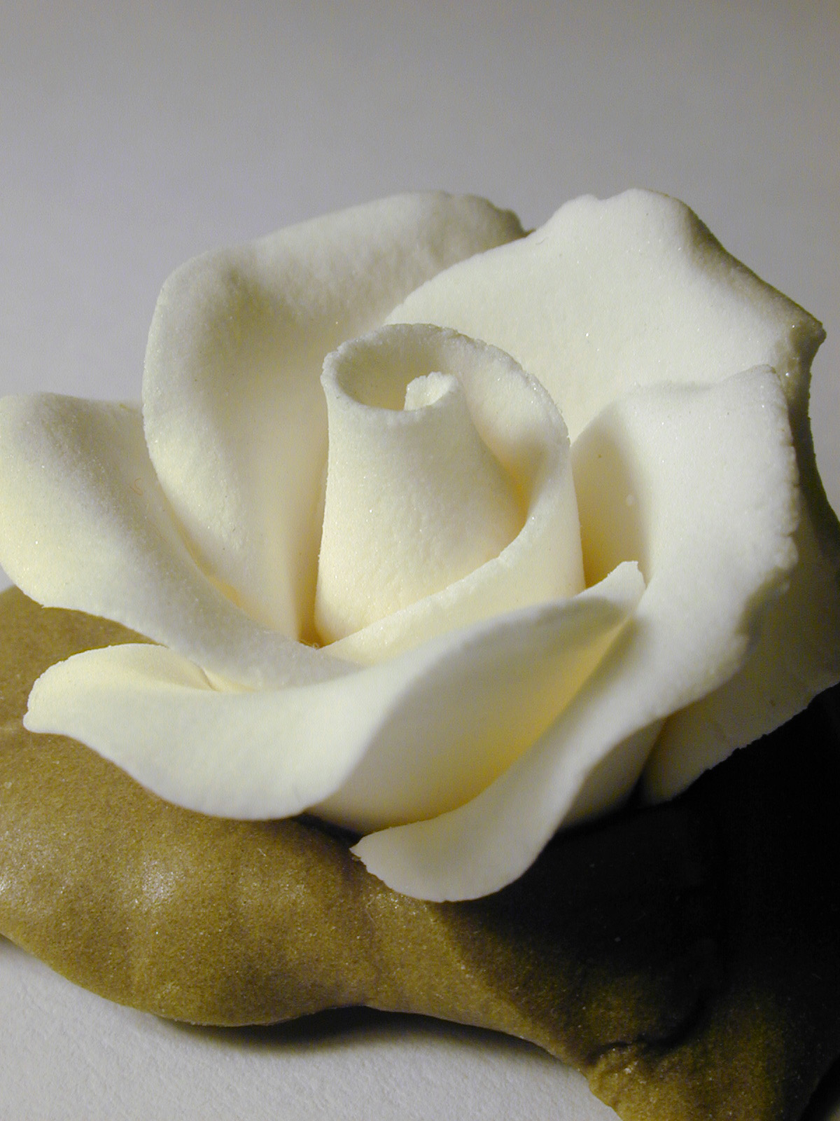 Image Description: Yellow icing sugar rose to decorate a cake, close up view on grey